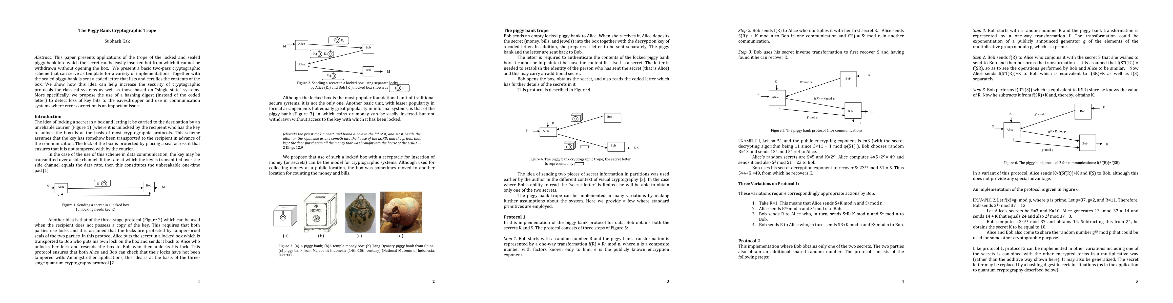 This paper presents applications of the trope of the locked and sealed piggy-bank into which the secret can be easily inserted but from which it cannot be withdrawn without opening the box. We present a basic two-pass cryptographic scheme that can serve as template for a variety of implementations. Together with the sealed piggy-bank is sent a coded letter that lists and certifies the contents of the box. We show how this idea can help increase the security of cryptographic protocols for classical systems as well as those based on "single-state" systems. More specifically, we propose the use of a hashing digest (instead of the coded letter) to detect loss of key bits to the eavesdropper and use in communication systems where error correction is an important issue.