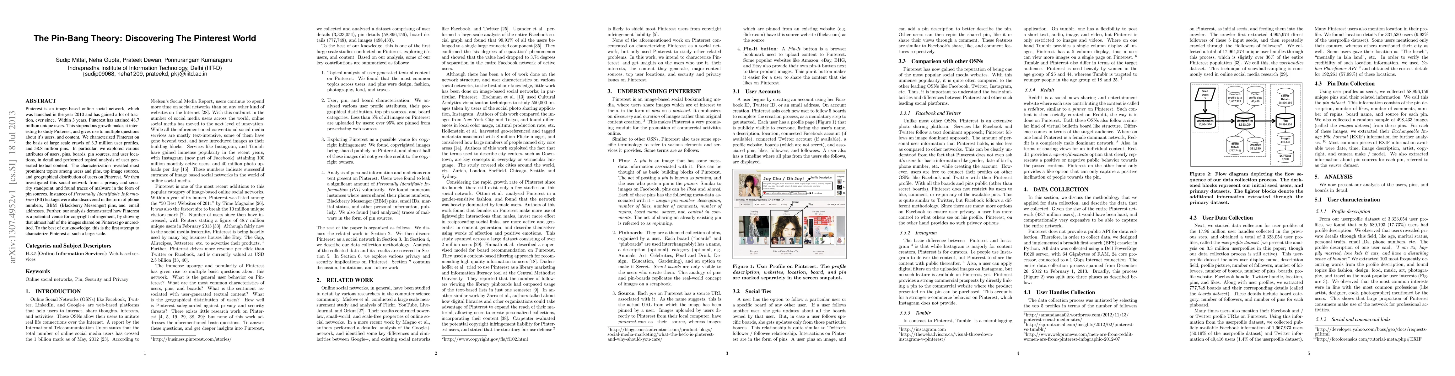 This paper characterizes Pinterest through large-scale data analysis, revealing prominent user topics, top image sources, and geographical user distribution. It also uncovers privacy and security issues, including malware, PII leakage, and widespread copyright infringement.