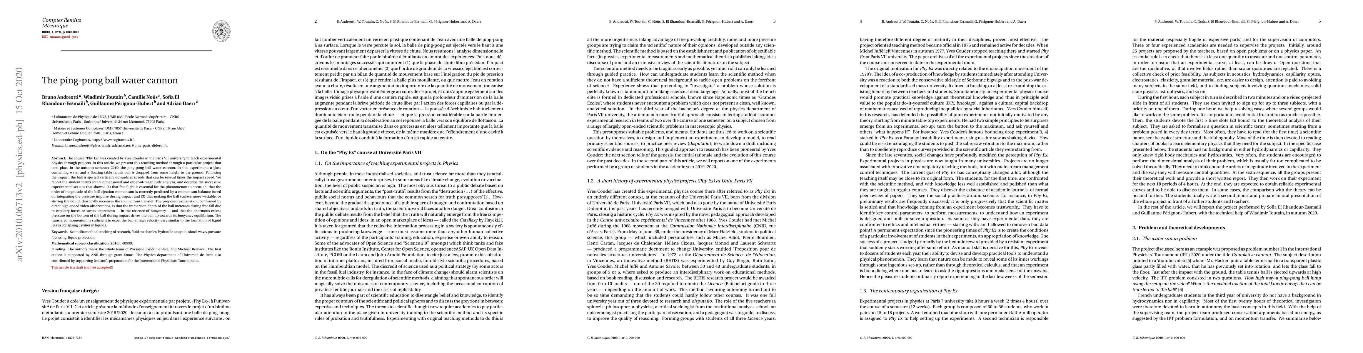 The course "Phy Ex" was created by Yves Couder in the Paris VII university to teach experimental physics through projects. In this article, we present this teaching method through a particular project that took place in the autumn semester 2019: the ping-pong ball water cannon. In this experiment, a glass containing water and a floating table tennis ball is dropped from some height to the ground. Following the impact, the ball is ejected vertically upwards at speeds that can be several times the impact speed. We report the student team's initial dimensional and order-of-magnitude analysis, and describe the successive experimental setups that showed (1) that free flight is essential for the phenomenon to occur, (2) that the order of magnitude of the ball ejection momentum is correctly predicted by a momentum balance based on integrating the pressure impulse during impact and (3) that making the ball surface more wettable, or stirring the liquid, drastically increases the momentum transfer. The proposed explanation, confirmed by direct high-speed video observations, is that the immersion depth of the ball increases during free fall due to capillary forces or vortex depression-in the absence of buoyancy-and that the enormous excess pressure on the bottom of the ball during impact drives the ball up towards its buoyancy equilibrium. The transfered momentum is sufficient to expel the ball at high velocity, very similar to the formation of liquid jets in collapsing cavities in liquids.