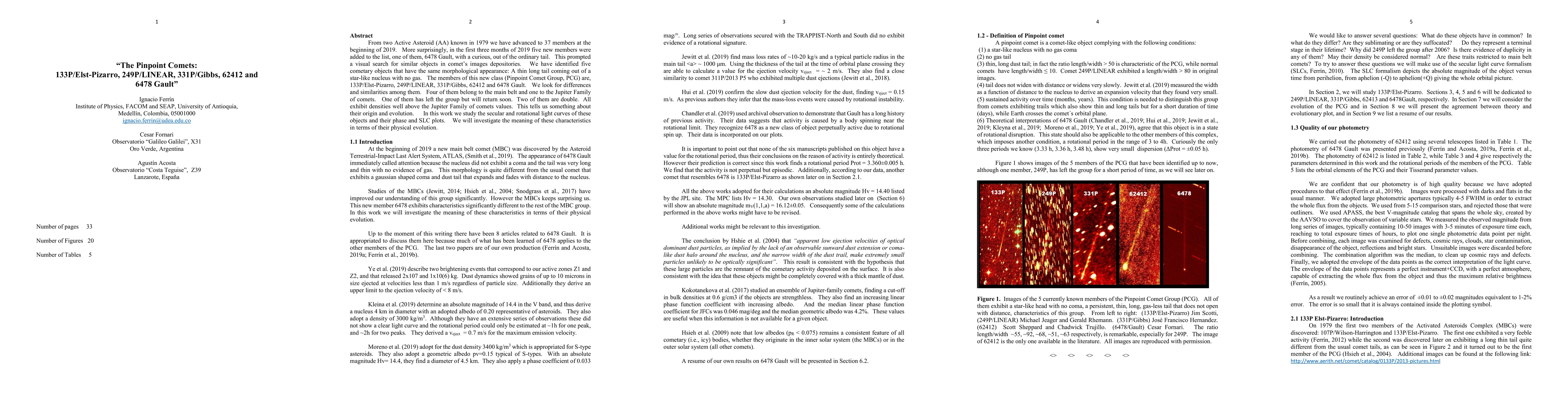 From two Active Asteroid (AA) known in 1979 we have advanced to 37 members at the beginning of 2019. More surprisingly, in the first three months of 2019 five new members were added to the list, one of them, 6478 Gault, with a curious, out of the ordinary tail. This prompted a visual search for similar objects in images depositories. We have identified five cometary objects that have the same morphological appearance: A thin long tail coming out of a star-like nucleus with no gas. The members of this new class (Pinpoint Comet Group, PCG) are, 133P/Elst-Pizarro, 249P/LINEAR, 331P/Gibbs, 62412 and 6478 Gault. We look for differences and similarities among them. Four of them belong to the main belt and one to the Jupiter Family of comets. One of them has left the group but will return soon. Two of them are double. All exhibit densities well above the Jupiter Family of comets values. This tells us something about their origin and evolution. In this work we study the secular and rotational light curves of these objects and their phase and SLC plots. We will investigate the meaning of these characteristics in terms of their physical evolution.