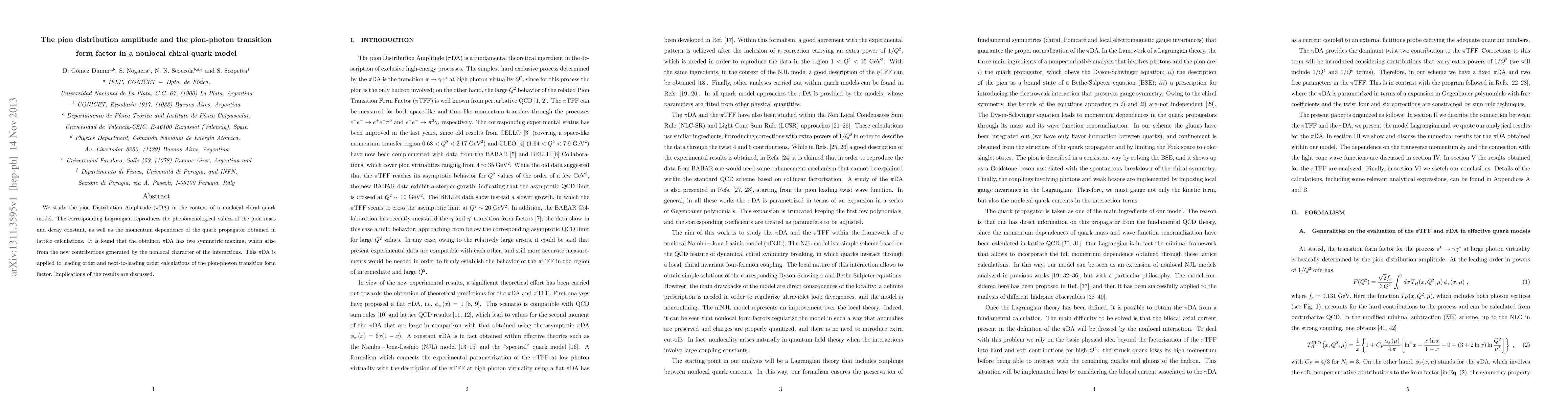 This paper investigates the pion Distribution Amplitude (\pi DA) using a nonlocal chiral quark model, revealing two symmetric maxima due to nonlocal interaction contributions. The model's Lagrangian accurately reproduces pion mass, decay constant, and lattice-calculated quark propagator momentum dependence, and it is applied to pion-photon transition form factor calculations.