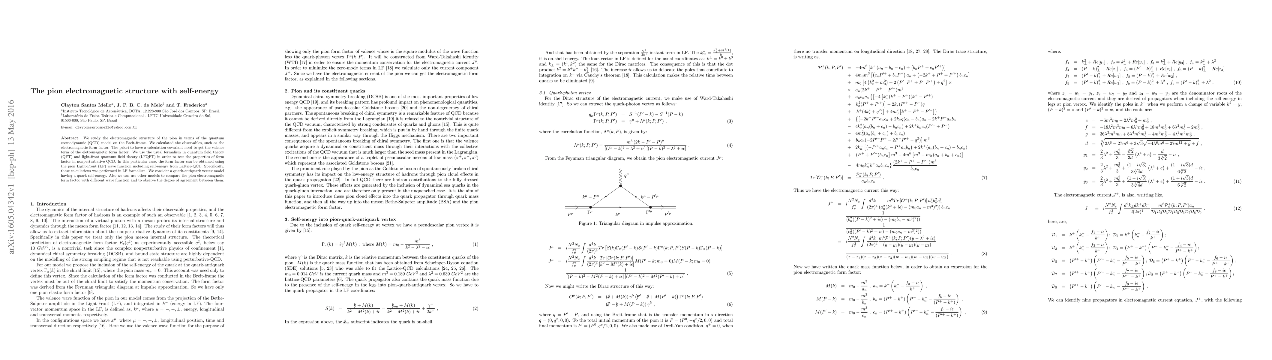 We study the electromagnetic structure of the pion in terms of the quantum cromodynamic~(QCD) model on the Breit-frame. We calculated the observables, such as the electromagnetic form factor. The priori to have a calculation covariant need to get the valence term of the eletromagnetic form factor. We use the usual formalism in quantum field theory (QFT) and light-front quantum field theory (LFQFT) in order to test the properties of form factor in nonperturbative QCD. In this particular case, the form factor can be obtained using the pion Light-Front (LF) wave function including self-energy from Lattice-QCD. Specifically, these calculations was performed in LF formalism. We consider a quark-antiquark vertex model having a quark self-energy. Also we can use other models to compare the pion electromagnetic form factor with different wave function and to observe the degree of agreement between them.