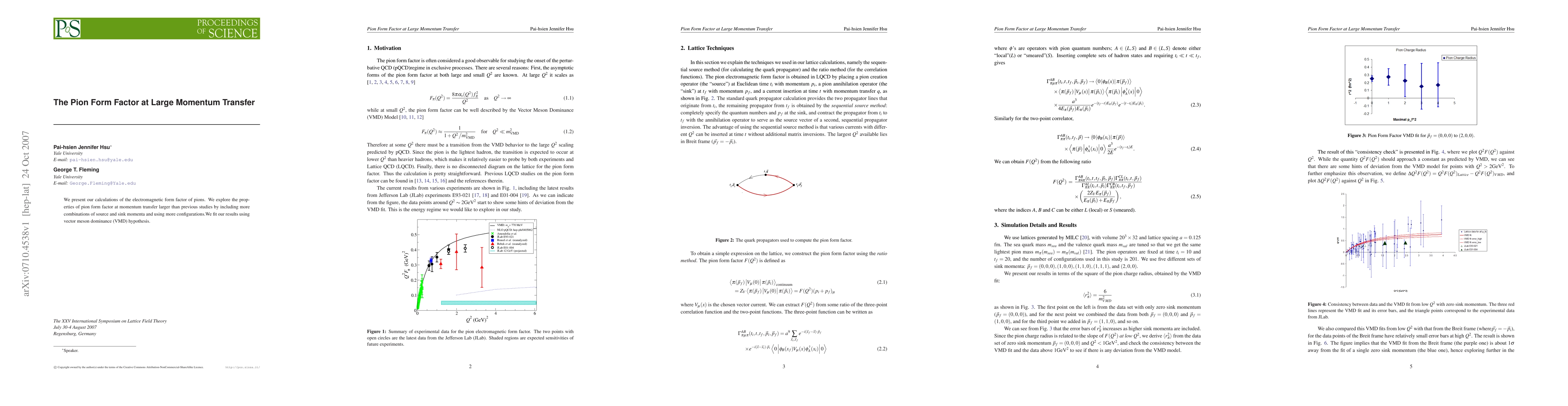 This research calculates the electromagnetic form factor of pions at large momentum transfer, employing vector meson dominance (VMD) hypothesis and utilizing extensive source and sink momentum combinations along with numerous configurations for more accurate results.