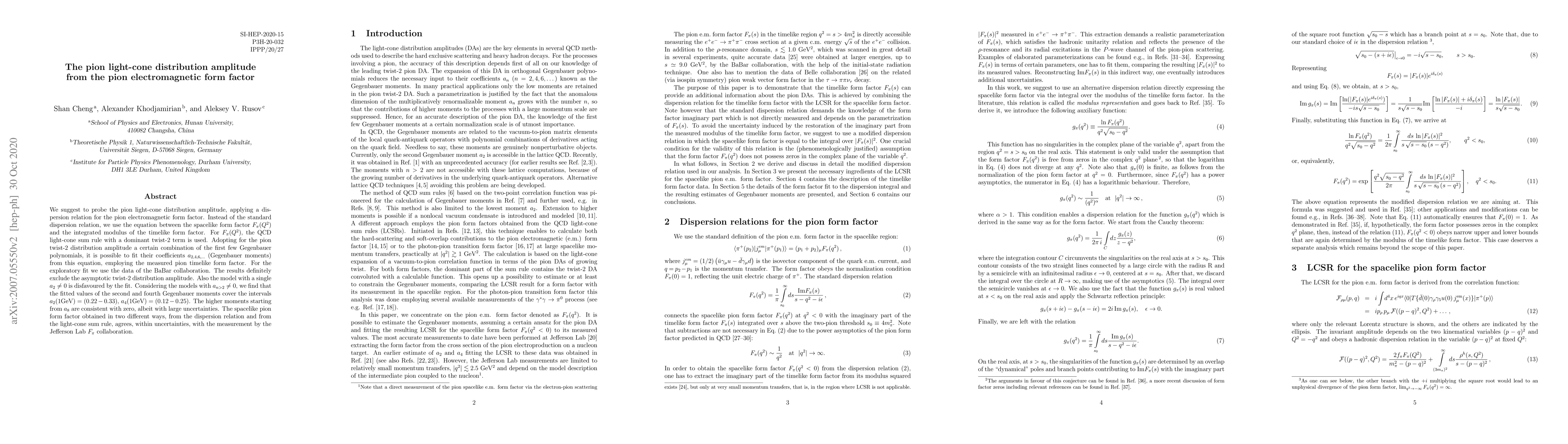 This paper investigates the pion light-cone distribution amplitude using a novel dispersion relation for the pion electromagnetic form factor, finding that the fitted values for the second and fourth Gegenbauer moments fall within specified intervals, while higher moments are consistent with zero. The results exclude the asymptotic twist-2 distribution amplitude.