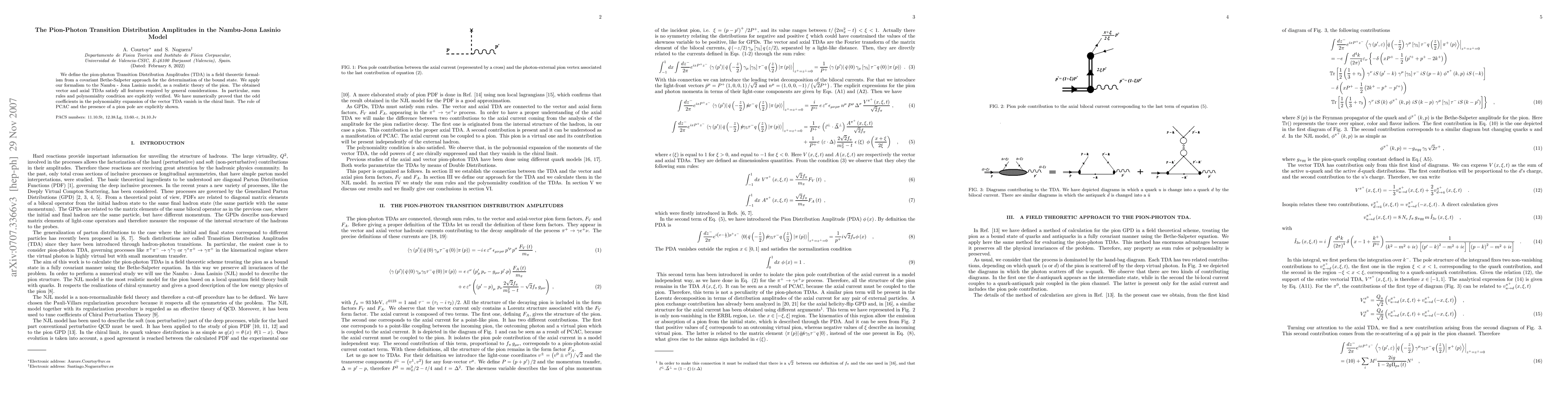 We define the pion-photon Transition Distribution Amplitudes (TDA) in a field theoretic formalism from a covariant Bethe-Salpeter approach for the determination of the bound state. We apply our formalism to the Nambu - Jona Lasinio model, as a realistic theory of the pion. The obtained vector and axial TDAs satisfy all features required by general considerations. In particular, sum rules and polynomiality condition are explicitly verified. We have numerically proved that the odd coefficients in the polynomiality expansion of the vector TDA vanish in the chiral limit. The role of PCAC and the presence of a pion pole are explicitly shown.