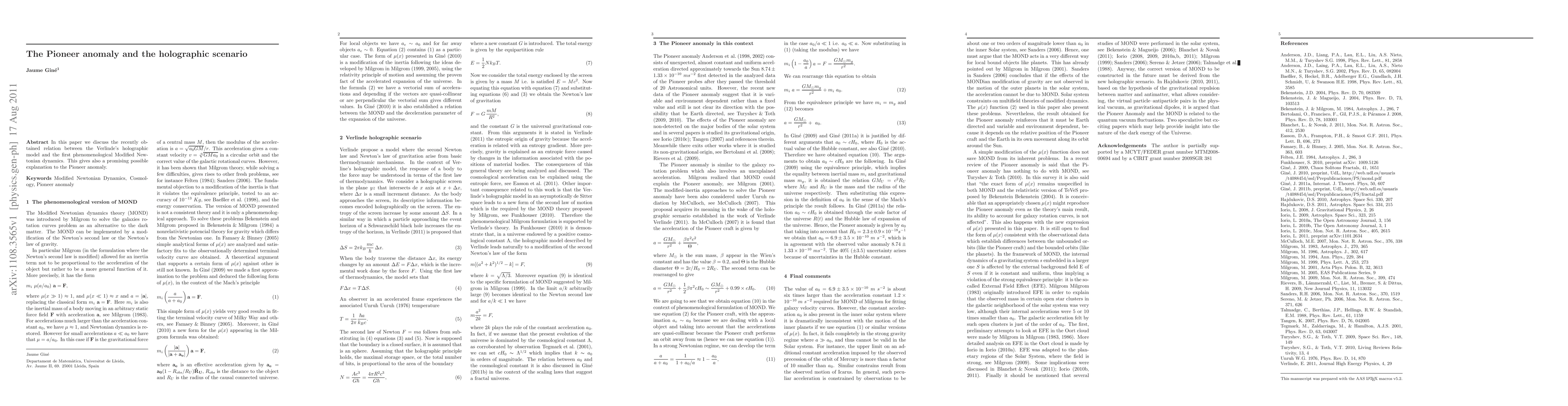 Summary: This paper explores the connection between Verlinde's holographic model and Modified Newtonian Dynamics, offering a potential explanation for the Pioneer anomaly, a discrepancy in the spacecraft's observed motion.