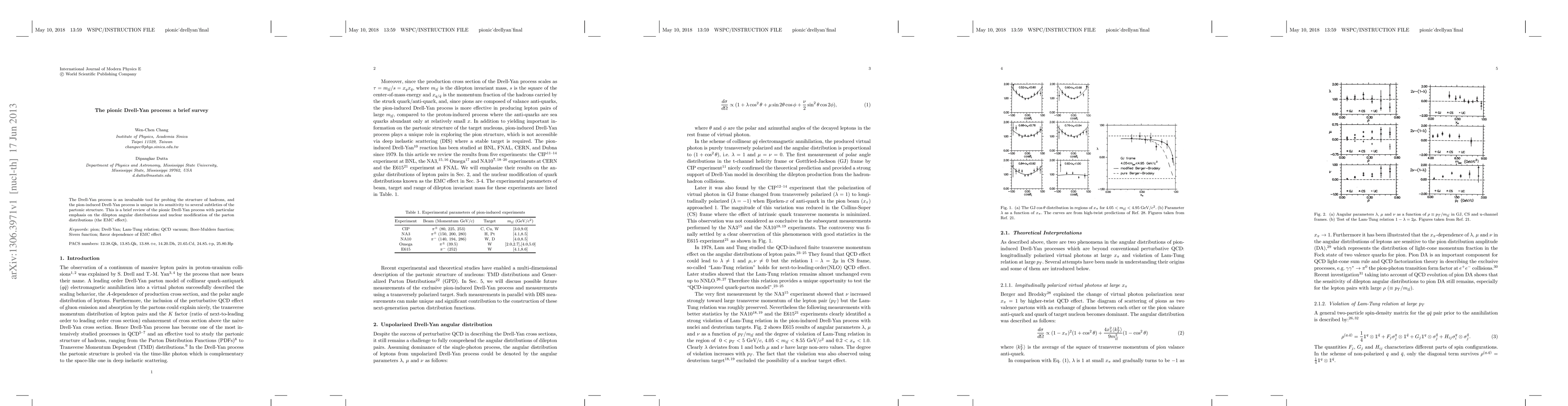 This paper reviews the pionic Drell-Yan process, highlighting its unique sensitivity to partonic structure subtleties, particularly focusing on dilepton angular distributions and the nuclear modification of parton distributions known as the EMC effect.