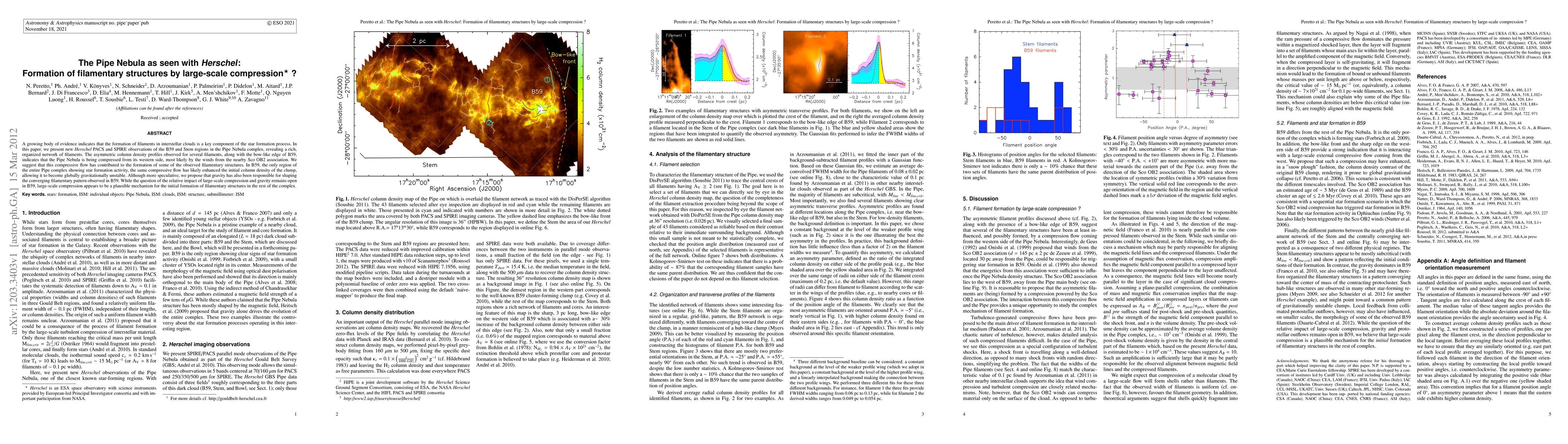 This paper explores the formation of filamentary structures in the Pipe Nebula using Herschel observations, suggesting that large-scale compression from nearby winds likely contributes to their formation. The study highlights the role of compressive flows in enhancing column densities and potentially triggering star formation in specific regions.