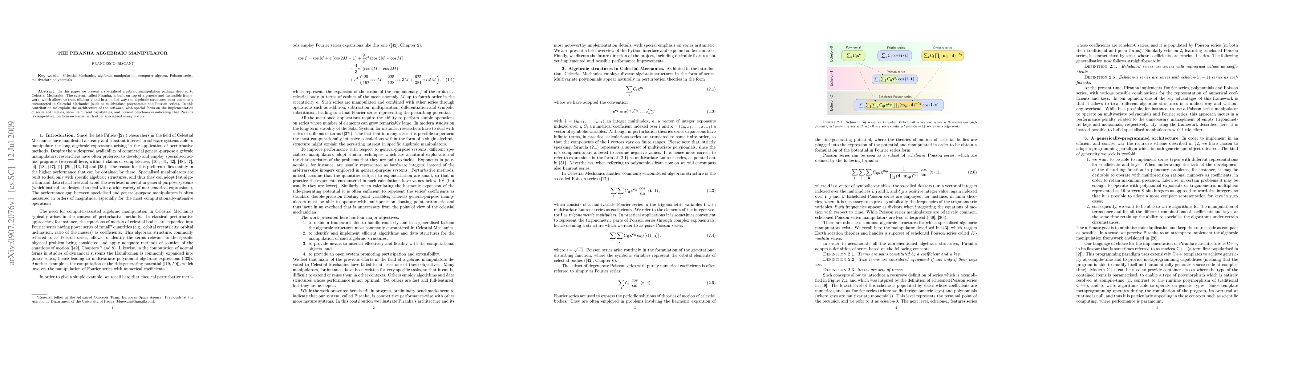 In this paper we present a specialised algebraic manipulation package devoted to Celestial Mechanics. The system, called Piranha, is built on top of a generic and extensible framework, which allows to treat efficiently and in a unified way the algebraic structures most commonly encountered in Celestial Mechanics (such as multivariate polynomials and Poisson series). In this contribution we explain the architecture of the software, with special focus on the implementation of series arithmetics, show its current capabilities, and present benchmarks indicating that Piranha is competitive, performance-wise, with other specialised manipulators.