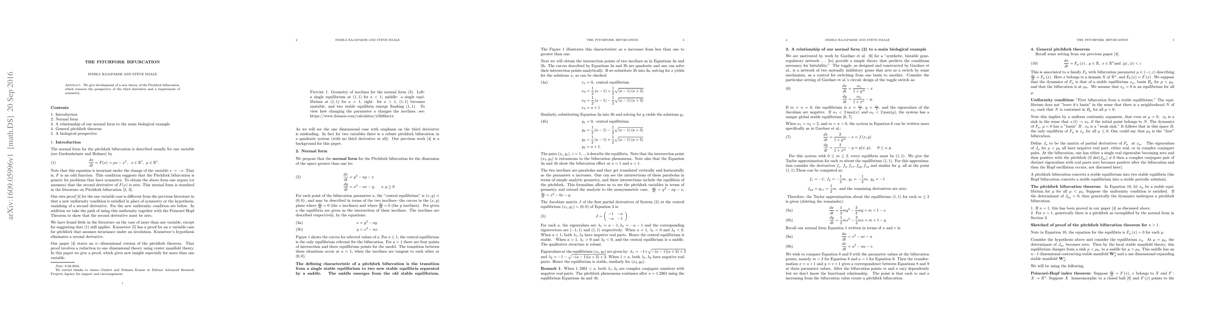 The paper presents a novel, robust theory of Pitchfork bifurcations in two-variable systems, eliminating the need for symmetry and third derivative assumptions, and demonstrates its application to a biological example.