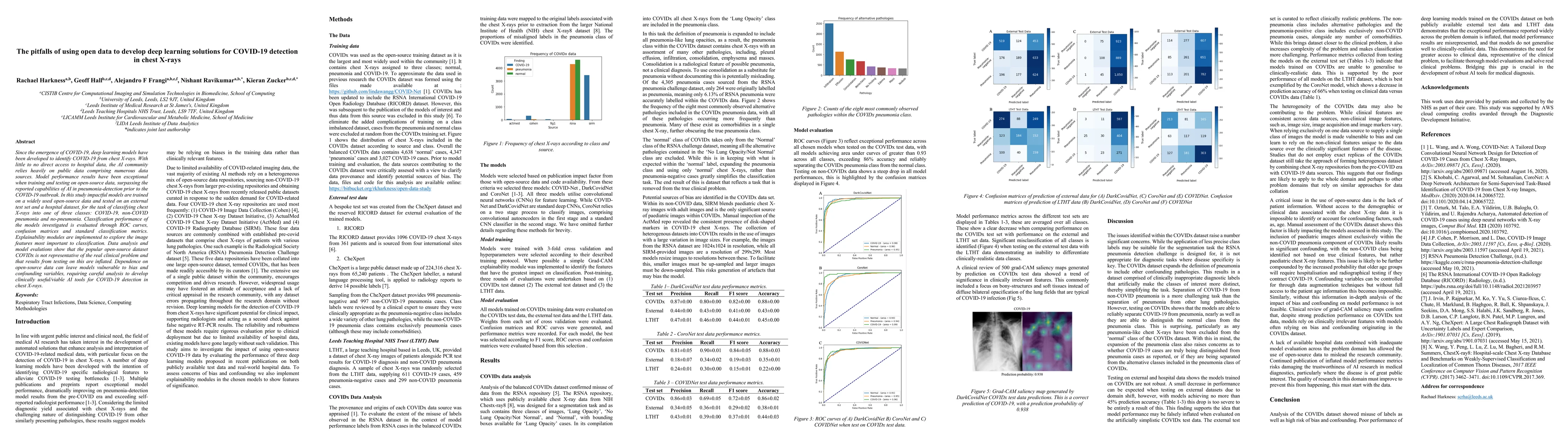 Since the emergence of COVID-19, deep learning models have been developed to identify COVID-19 from chest X-rays. With little to no direct access to hospital data, the AI community relies heavily on public data comprising numerous data sources. Model performance results have been exceptional when training and testing on open-source data, surpassing the reported capabilities of AI in pneumonia-detection prior to the COVID-19 outbreak. In this study impactful models are trained on a widely used open-source data and tested on an external test set and a hospital dataset, for the task of classifying chest X-rays into one of three classes: COVID-19, non-COVID pneumonia and no-pneumonia. Classification performance of the models investigated is evaluated through ROC curves, confusion matrices and standard classification metrics. Explainability modules are implemented to explore the image features most important to classification. Data analysis and model evaluations show that the popular open-source dataset COVIDx is not representative of the real clinical problem and that results from testing on this are inflated. Dependence on open-source data can leave models vulnerable to bias and confounding variables, requiring careful analysis to develop clinically useful/viable AI tools for COVID-19 detection in chest X-rays.