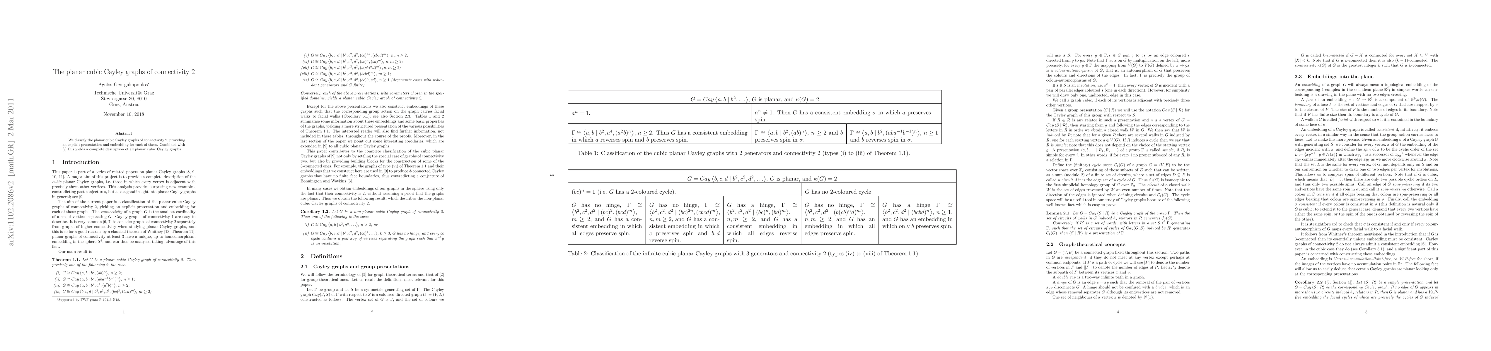 This paper classifies planar cubic Cayley graphs with connectivity 2, offering explicit presentations and embeddings for each. This work, together with another study, provides a complete description of all planar cubic Cayley graphs.