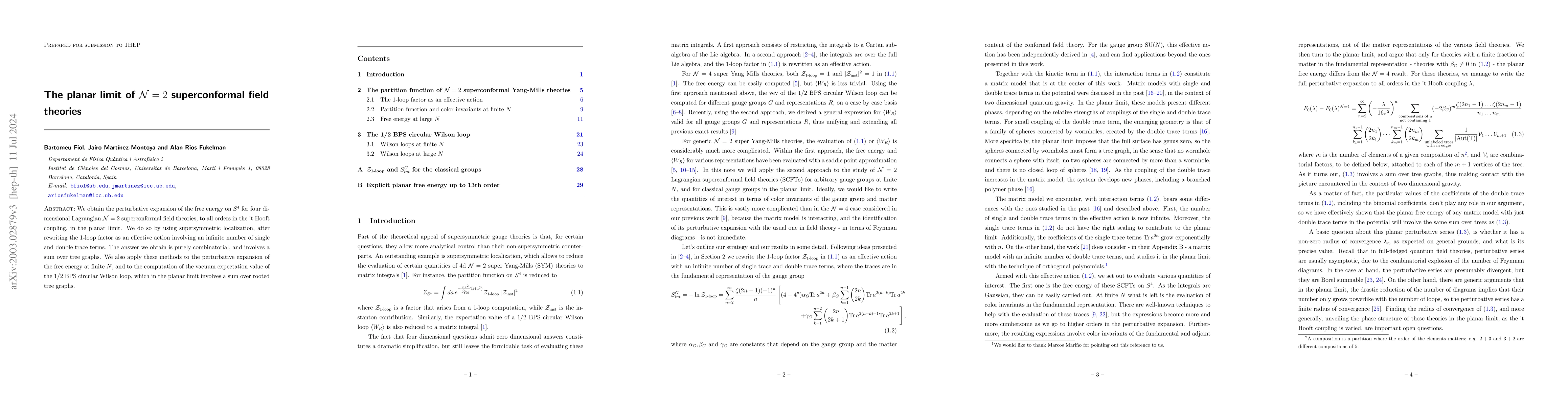 We obtain the perturbative expansion of the free energy on $S^4$ for four dimensional Lagrangian ${\cal N}=2$ superconformal field theories, to all orders in the 't Hooft coupling, in the planar limit. We do so by using supersymmetric localization, after rewriting the 1-loop factor as an effective action involving an infinite number of single and double trace terms. The answer we obtain is purely combinatorial, and involves a sum over tree graphs. We also apply these methods to the perturbative expansion of the free energy at finite $N$, and to the computation of the vacuum expectation value of the 1/2 BPS circular Wilson loop, which in the planar limit involves a sum over rooted tree graphs.