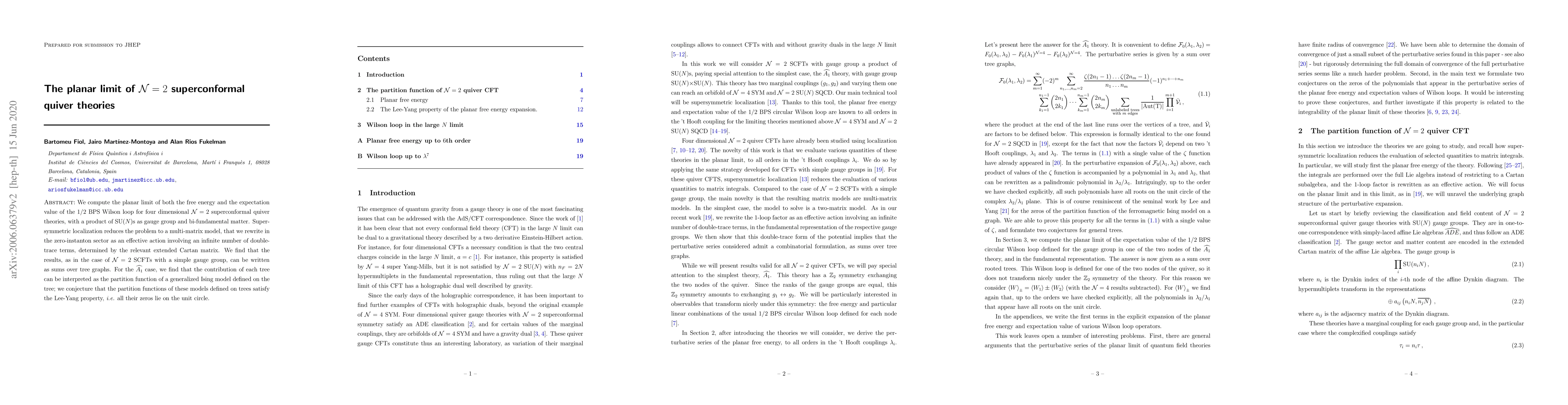 This paper computes the planar limit of free energy and $1/2$ BPS Wilson loop expectation values in four-dimensional $\mathcal{N}=2$ superconformal quiver theories, revealing results expressible as sums over tree graphs. It conjectures that partition functions of generalized Ising models on these trees satisfy the Lee-Yang property.