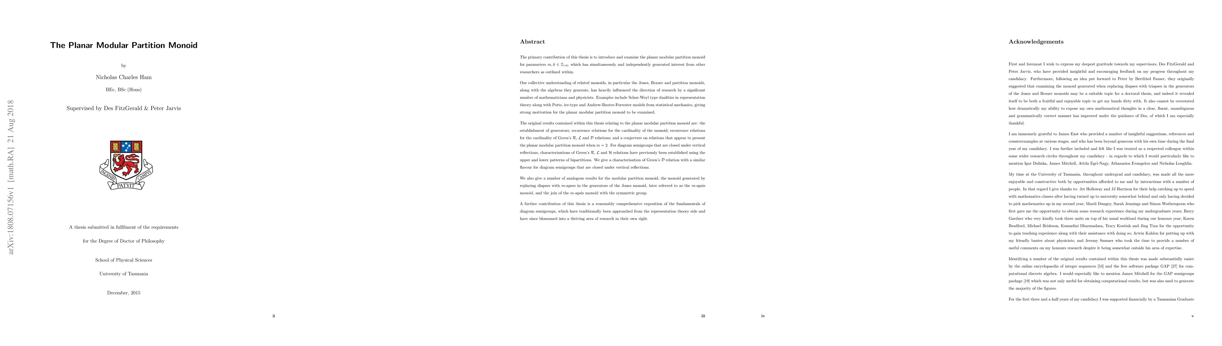 This paper introduces and explores the planar modular partition monoid, establishing its generators and recurrence relations for its cardinality and Green's relations. It also provides a comprehensive overview of diagram semigroups, contributing to the understanding of their Green's relations and their applications in representation theory and statistical mechanics.