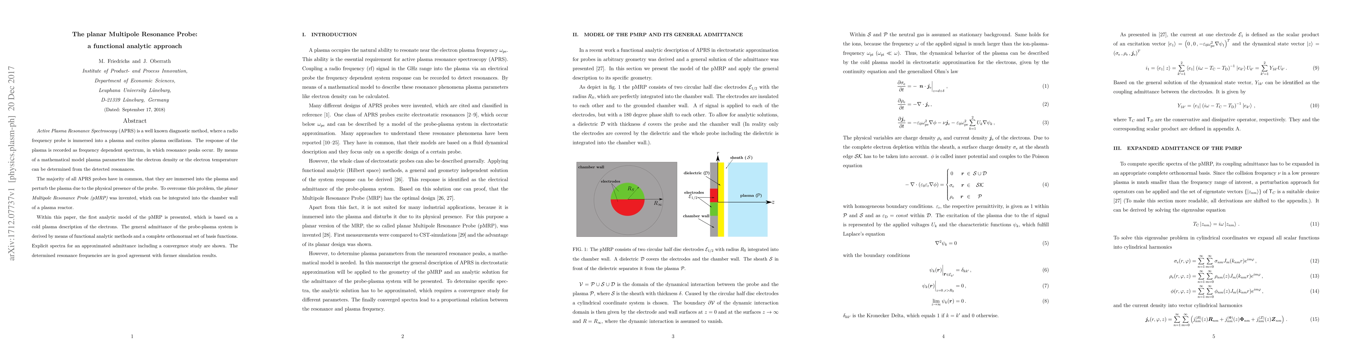 Researchers developed a new plasma resonance probe that can be integrated into chamber walls, allowing for non-invasive measurements of plasma parameters. The study presents an analytic model of the probe using functional analytic methods, showing good agreement with previous simulation results.