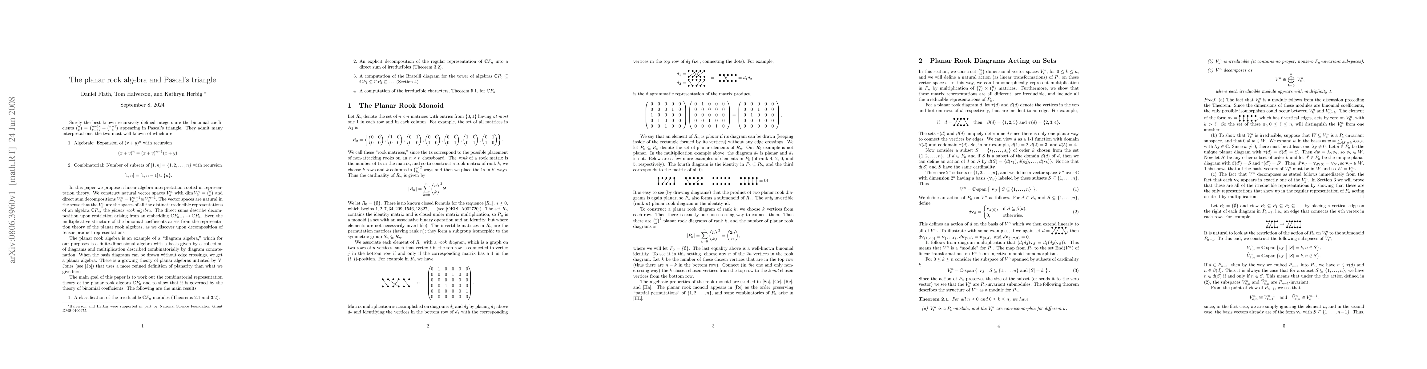 This paper explores the combinatorial representation theory of the planar rook algebra, constructing irreducible representations and decomposing its regular representation. It reveals that the Bratteli diagram of the algebra's tower corresponds to Pascal's triangle, linking binomial identities to the algebra's representation theory.