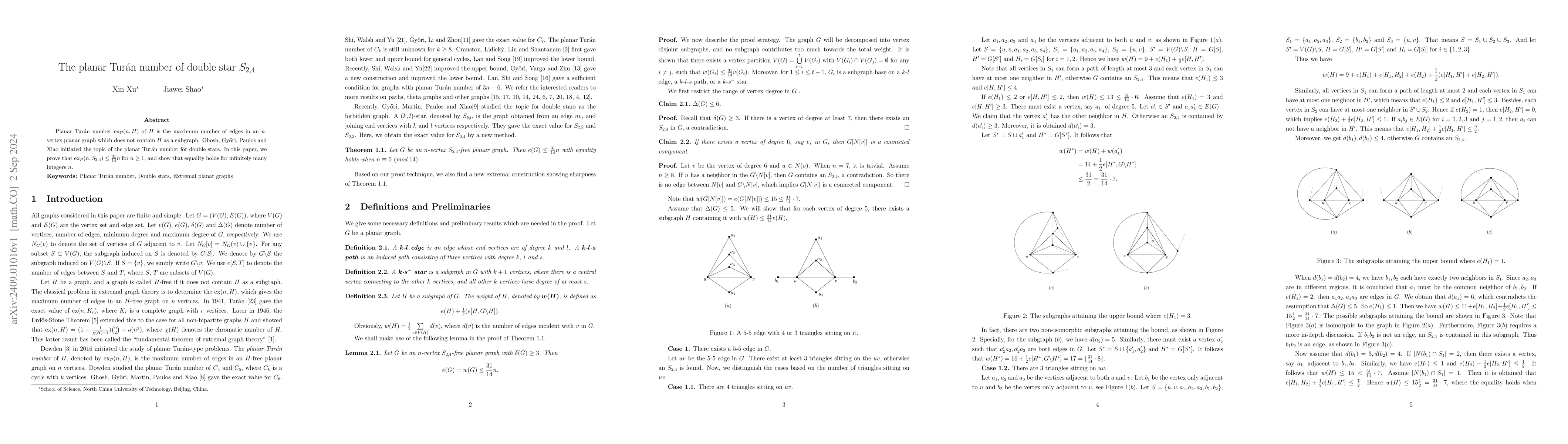This paper determines the planar Turán number for the double star $S_{2,4}$, proving that $ex_{\mathcal{P}}(n,S_{2,4}) \leq \frac{31}{14}n$ for $n \geq 1$, and demonstrates that this bound is tight for infinitely many values of $n$.