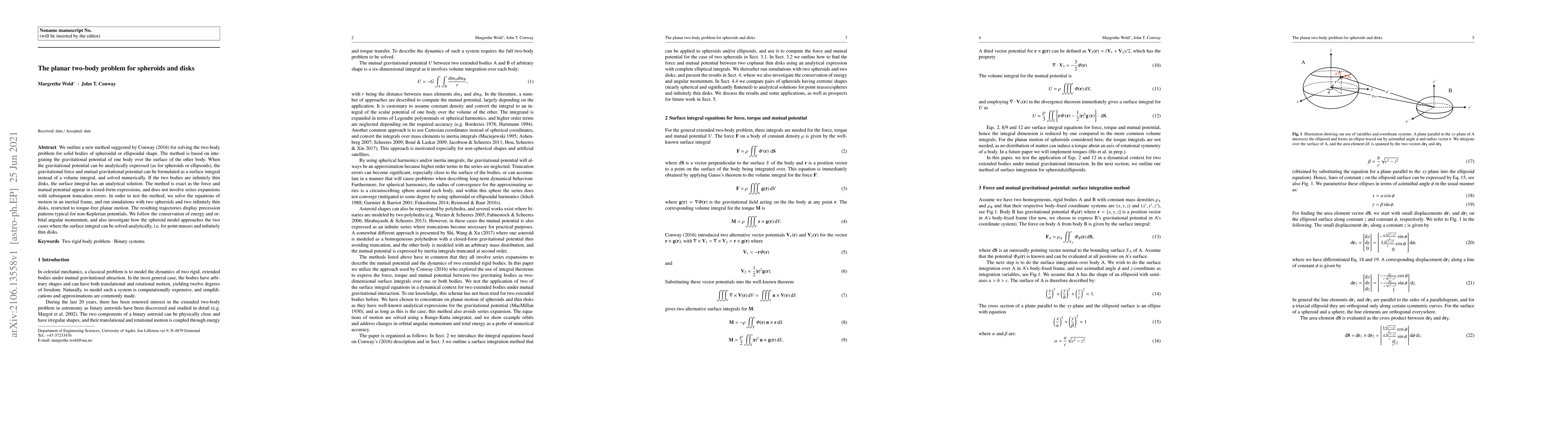 We outline a new method suggested by Conway (2016) for solving the two-body problem for solid bodies of spheroidal or ellipsoidal shape. The method is based on integrating the gravitational potential of one body over the surface of the other body. When the gravitational potential can be analytically expressed (as for spheroids or ellipsoids), the gravitational force and mutual gravitational potential can be formulated as a surface integral instead of a volume integral, and solved numerically. If the two bodies are infinitely thin disks, the surface integral has an analytical solution. The method is exact as the force and mutual potential appear in closed-form expressions, and does not involve series expansions with subsequent truncation errors. In order to test the method, we solve the equations of motion in an inertial frame, and run simulations with two spheroids and two infinitely thin disks, restricted to torque-free planar motion. The resulting trajectories display precession patterns typical for non-Keplerian potentials. We follow the conservation of energy and orbital angular momentum, and also investigate how the spheroid model approaches the two cases where the surface integral can be solved analytically, i.e. for point masses and infinitely thin disks.