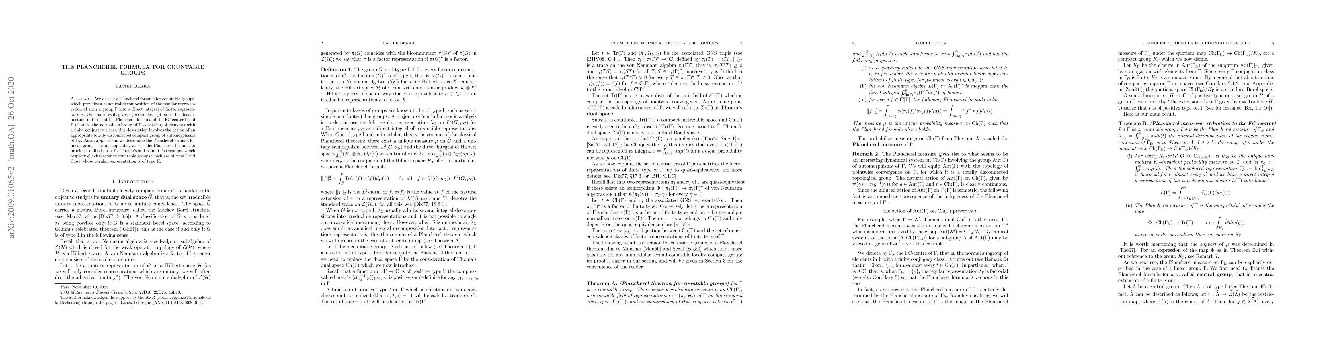 This paper establishes a Plancherel formula for countable groups, decomposing their regular representation into a direct integral of factor representations via the FC-center's Plancherel formula. It applies this decomposition to linear groups and provides a unified proof for theorems characterizing type I and type II regular representations.