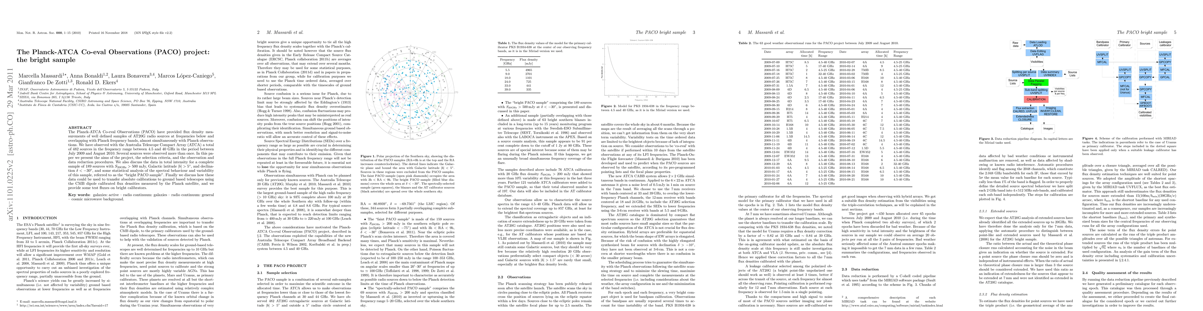 The Planck-ATCA Co-eval Observations (PACO) have provided flux density measurements of well defined samples of AT20G radio sources at frequencies below and overlapping with Planck frequency bands, almost simultaneously with Planck observations. We have observed with the Australia Telescope Compact Array (ATCA) a total of 482 sources in the frequency range between 4.5 and 40 GHz in the period between July 2009 and August 2010. Several sources were observed more than once. In this paper we present the aims of the project, the selection criteria, and the observation and data reduction procedures. We also discuss the data in total intensity for a complete sample of 189 sources with S(20 GHz)>500 mJy, Galactic latitude |b|>5deg, and declination <-30deg, and some statistical analysis of the spectral behaviour and variability of this sample, referred to as the "bright PACO sample". Finally we discuss how these data could be used to transfer absolute calibrations to ground based telescopes using the CMB dipole calibrated flux densities measured by the Planck satellite, and we provide some test fluxes on bright calibrators.