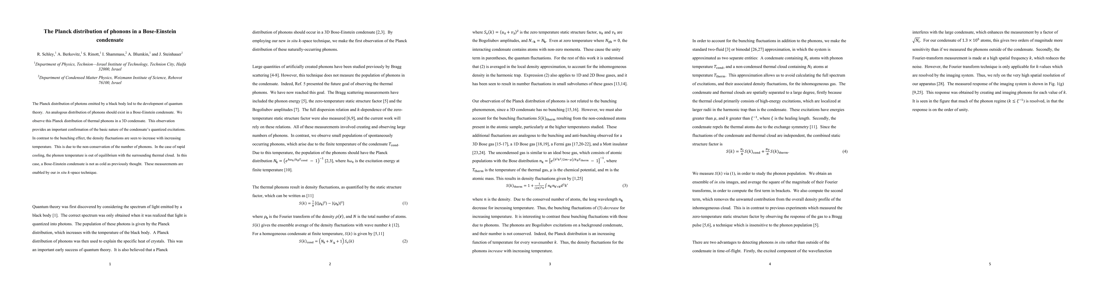 The Planck distribution of photons emitted by a black body led to the development of quantum theory. An analogous distribution of phonons should exist in a Bose-Einstein condensate. We observe this Planck distribution of thermal phonons in a 3D condensate. This observation provides an important confirmation of the basic nature of the condensate's quantized excitations. In contrast to the bunching effect, the density fluctuations are seen to increase with increasing temperature. This is due to the non-conservation of the number of phonons. In the case of rapid cooling, the phonon temperature is out of equilibrium with the surrounding thermal cloud. In this case, a Bose-Einstein condensate is not as cold as previously thought. These measurements are enabled by our in situ k-space technique.
