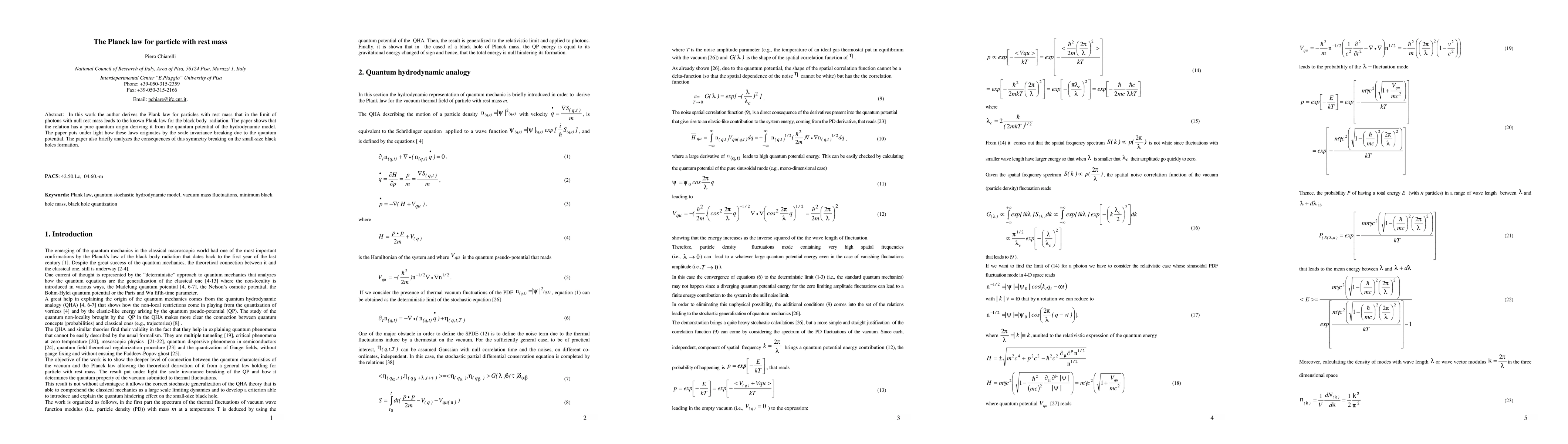 In this work the author derives the Plank law for particles with rest mass that in the limit of photons with null rest mass leads to the known Plank law for the black body radiation. The paper shows that the relation has a pure quantum origin deriving it from the quantum potential of the hydrodynamic model. The paper puts under light how these laws originates by the scale invariance breaking due to the quantum potential. The paper also briefly analyzes the consequences of this symmetry breaking on the small-size black holes formation.
