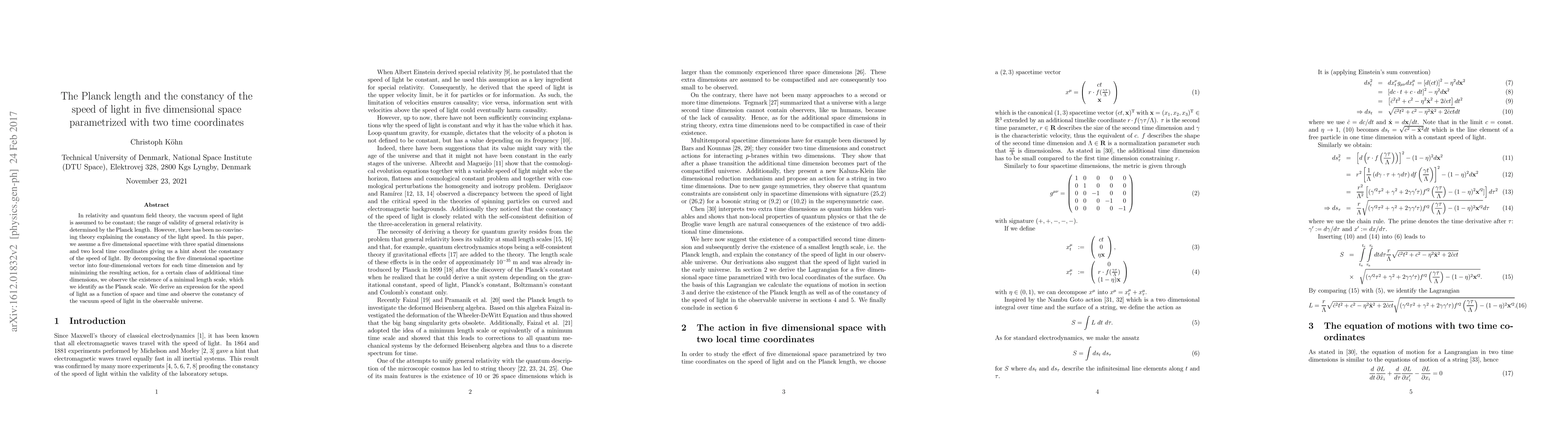 This paper explores a five-dimensional spacetime with two time coordinates to explain the constancy of the speed of light. It identifies a minimal length scale, the Planck length, through action minimization, and derives a speed of light expression that maintains constancy in the observable universe.
