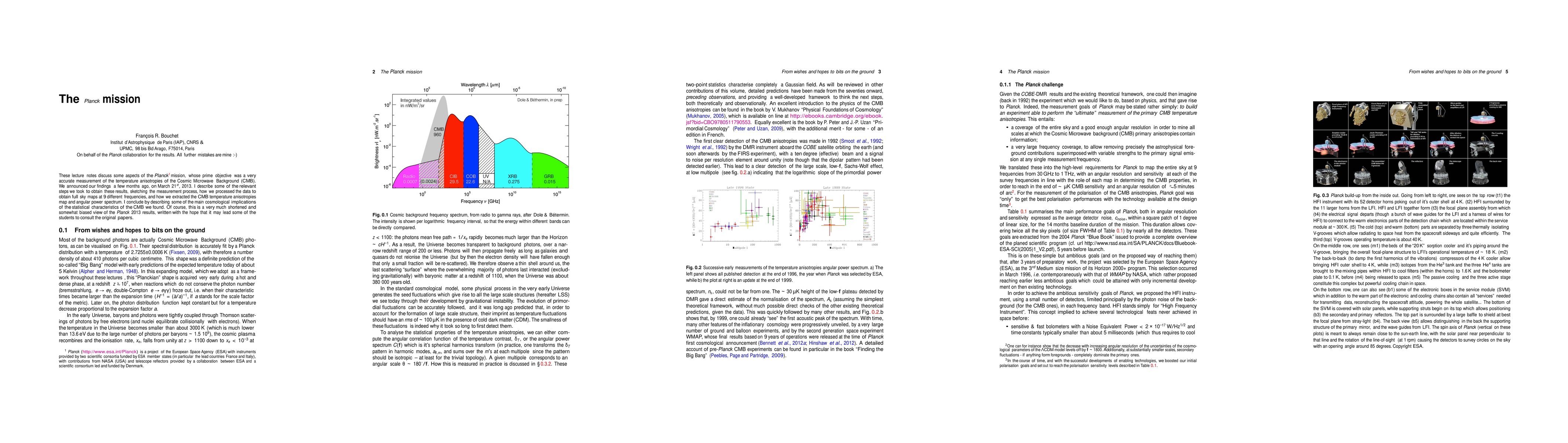 These lecture from the 100th Les Houches summer school on "Post-planck cosmology" of July 2013 discuss some aspects of the Planck mission, whose prime objective was a very accurate measurement of the temperature anisotropies of the Cosmic Microwave Background (CMB). We announced our findings a few months ago, on March 21$^{st}$, 2013. I describe some of the relevant steps we took to obtain these results, sketching the measurement process, how we processed the data to obtain full sky maps at 9 different frequencies, and how we extracted the CMB temperature anisotropies map and angular power spectrum. I conclude by describing some of the main cosmological implications of the statistical characteristics of the CMB we found. Of course, this is a very much shortened and somewhat biased view of the \Planck\ 2013 results, written with the hope that it may lead some of the students to consult the original papers.