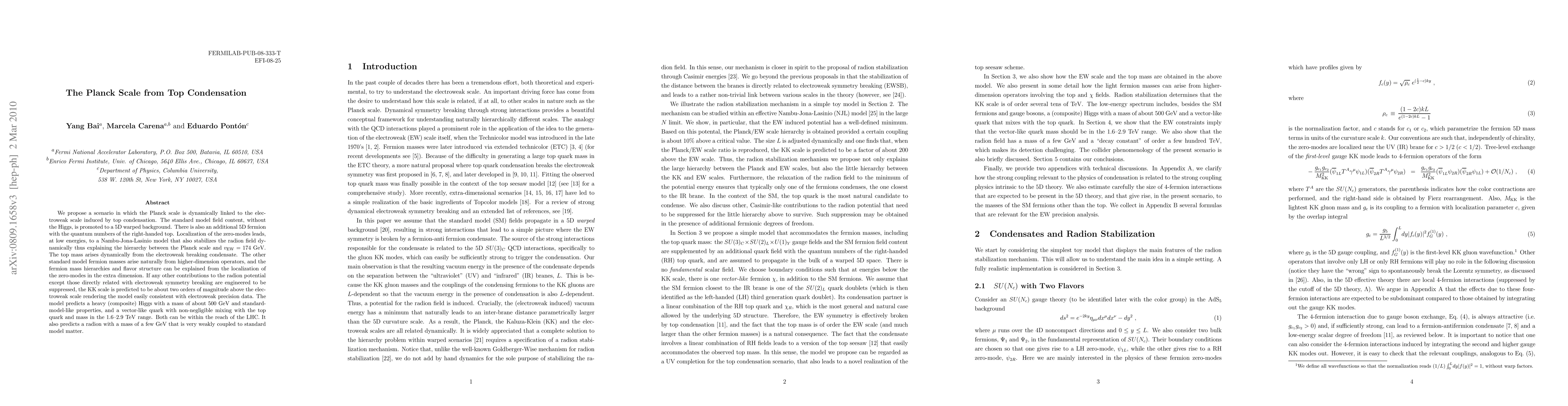 The technical contribution of this work lies in proposing a new mechanism for top condensation in a 5D warped space that dynamically links the Planck and electroweak scales, explaining the hierarchy and generating fermion masses through wavefunction localization in the extra dimension.