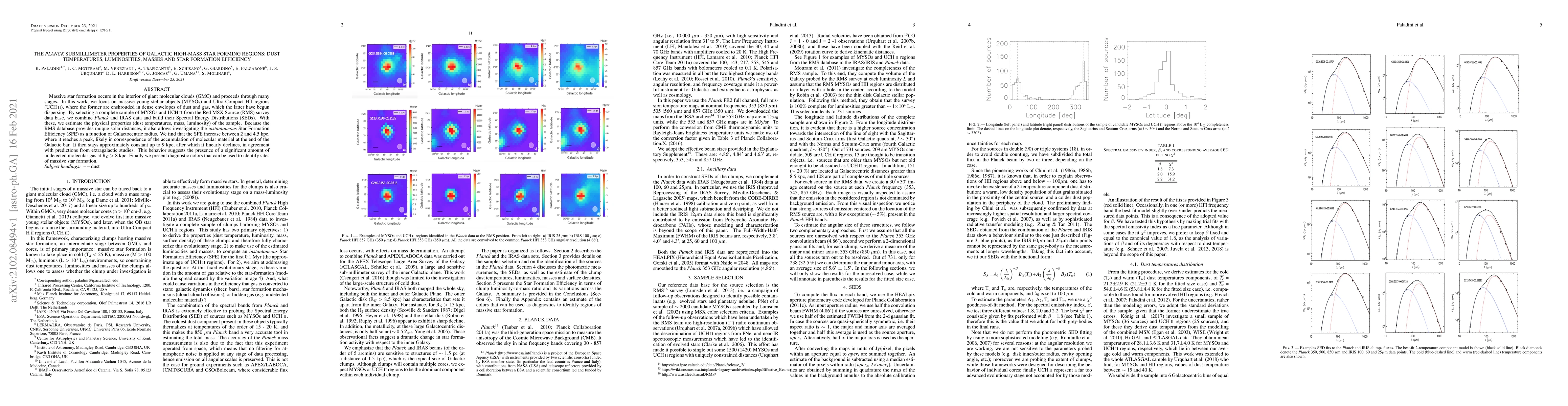 Massive star formation occurs in the interior of giant molecular clouds (GMC) and proceeds through many stages. In this work, we focus on massive young stellar objects (MYSOs) and Ultra-Compact HII regions (UCHII), where the former are enshrouded in dense envelopes of dust and gas, which the latter have begun dispersing. By selecting a complete sample of MYSOs and UCHII from the Red MSX Source (RMS) survey data base, we combine Planck and IRAS data and build their Spectral Energy Distributions (SEDs). With these, we estimate the physical properties (dust temperatures, mass, luminosity) of the sample. Because the RMS database provides unique solar distances, it also allows investigating the instantaneous Star Formation Efficiency (SFE) as a function of Galactocentric radius. We find that the SFE increase between 2 and 4.5 kpc, where it reaches a peak, likely in correspondence of the accumulation of molecular material at the end of the Galactic bar. It then stays approximately constant up to 9 kpc, after which it linearly declines, in agreement with predictions from extragalactic studies. This behavior suggests the presence of a significant amount of undetected molecular gas at R$_G$ $>$ 8 kpc. Finally we present diagnostic colors that can be used to identify sites of massive star formation.
