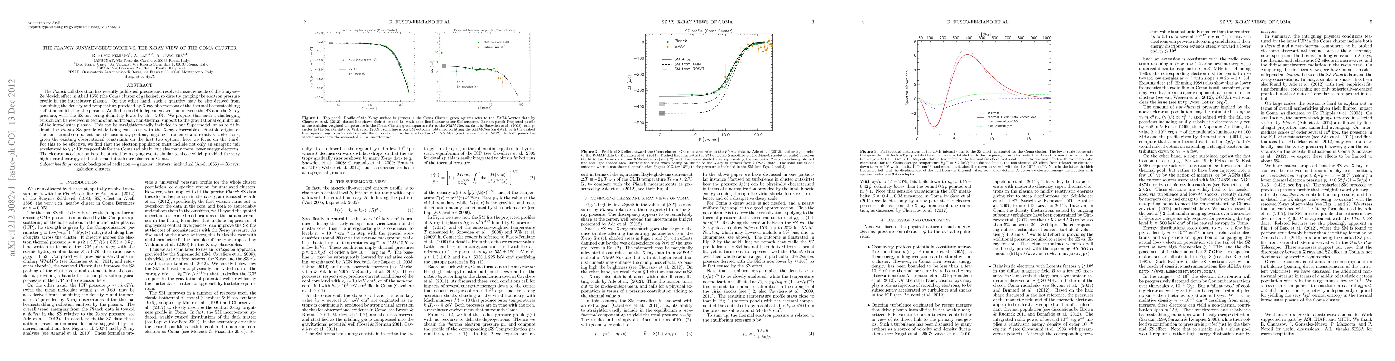 The Planck collaboration has recently published precise and resolved measurements of the Sunyaev-Zel'dovich effect in Abell 1656 (the Coma cluster of galaxies), so directly gauging the electron pressure profile in the intracluster plasma. On the other hand, such a quantity may be also derived from combining the density and temperature provided by X-ray observations of the thermal bremsstrahlung radiation emitted by the plasma. We find a model-independent tension between the SZ and the X-ray pressure, with the SZ one being definitely lower by 15-20%. We propose that such a challenging tension can be resolved in terms of an additional, non-thermal support to the gravitational equilibrium of the intracluster plasma. This can be straightforwardly included in our Supermodel, so as to fit in detail the Planck SZ profile while being consistent with the X-ray observables. Possible origins of the nonthermal component include cosmic-ray protons, ongoing turbulence, and relativistic electrons; given the existing observational constraints on the first two options, here we focus on the third. For this to be effective, we find that the electron population must include not only an energetic tail accelerated to gamma> 10^3 responsible for the Coma radiohalo, but also many more, lower energy electrons. The electron acceleration is to be started by merging events similar to those which provided the very high central entropy of the thermal intracluster plasma in Coma.