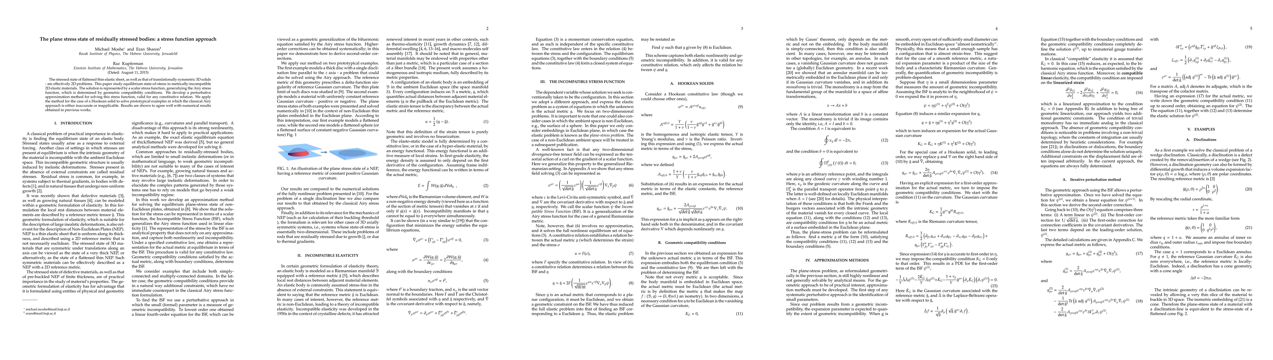 The stressed state of flattened thin elastic sheet, as well as that of translationally symmetric 3D solids, are effectively 2D problems. This paper study equilibrium state-of-stress in metrically-incompatible 2D elastic materials. The solution is represented by a scalar stress function, generalizing the Airy stress function, which is determined by geometric compatibility conditions. We develop a perturbative approximation method for solving this stress function, valid for any constitutive relation. We apply the method for the case of a Hookean solid to solve prototypical examples in which the classical Airy approach is either inaccurate or inapplicable. Results are shown to agree well with numerical results obtained in previous works.