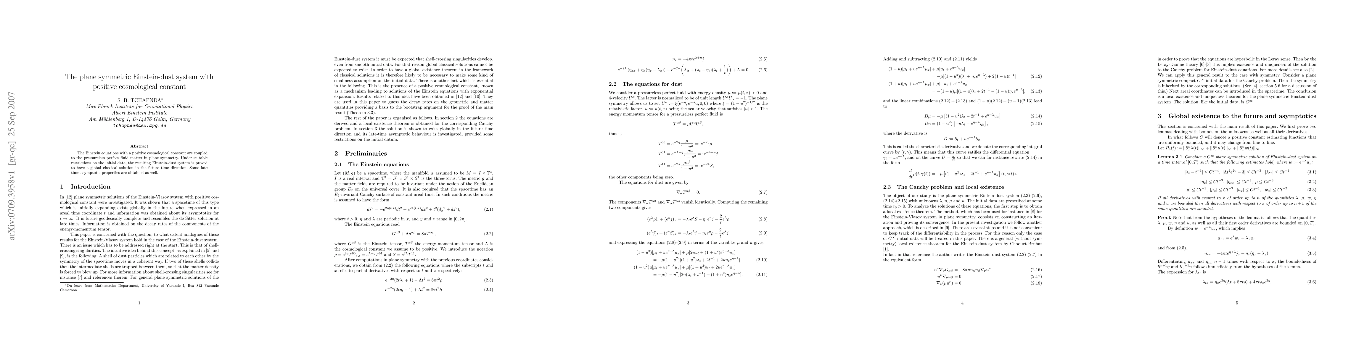 This paper proves the existence of a global classical solution for the plane symmetric Einstein-dust system with a positive cosmological constant, coupled to a pressureless perfect fluid, under specific initial data conditions, and explores its late-time asymptotic behavior.