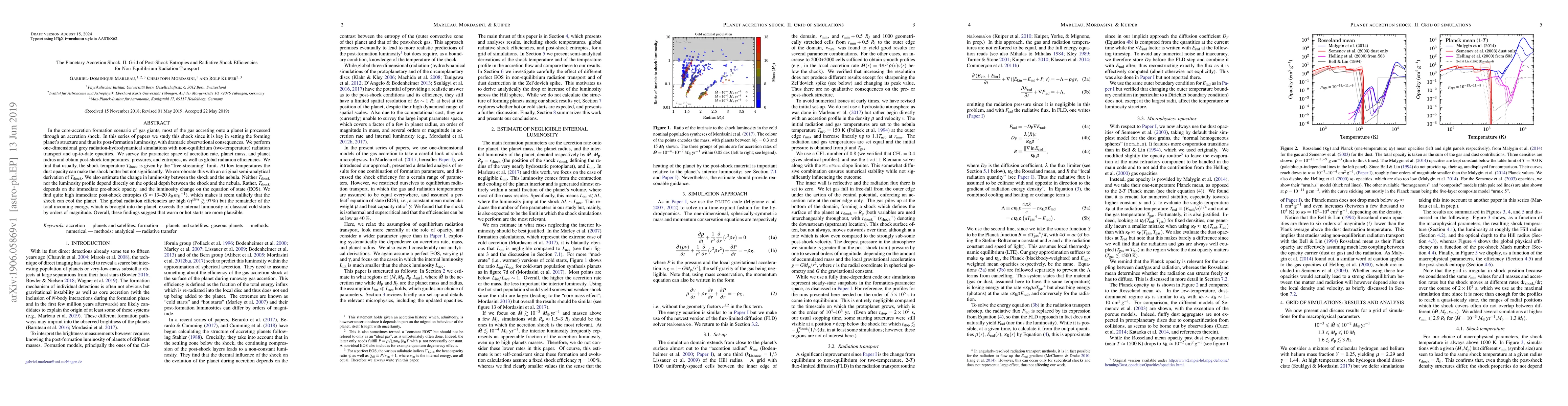 In the core-accretion formation scenario of gas giants, most of the gas accreting onto a planet is processed through an accretion shock. In this series of papers we study this shock since it is key in setting the forming planet's structure and thus its post-formation luminosity, with dramatic observational consequences. We perform one-dimensional grey radiation-hydrodynamical simulations with non-equilibrium (two-temperature) radiation transport and up-to-date opacities. We survey the parameter space of accretion rate, planet mass, and planet radius and obtain post-shock temperatures, pressures, and entropies, as well as global radiation efficiencies. We find that usually, the shock temperature T_shock is given by the "free-streaming" limit. At low temperatures the dust opacity can make the shock hotter but not significantly. We corroborate this with an original semi-analytical derivation of T_shock . We also estimate the change in luminosity between the shock and the nebula. Neither T_shock nor the luminosity profile depend directly on the optical depth between the shock and the nebula. Rather, T_shock depends on the immediate pre-shock opacity, and the luminosity change on the equation of state (EOS). We find quite high immediate post-shock entropies (S ~ 13-20 kB/mH), which makes it seem unlikely that the shock can cool the planet. The global radiation efficiencies are high (eta^phys > 97%) but the remainder of the total incoming energy, which is brought into the planet, exceeds the internal luminosity of classical cold starts by orders of magnitude. Overall, these findings suggest that warm or hot starts are more plausible.