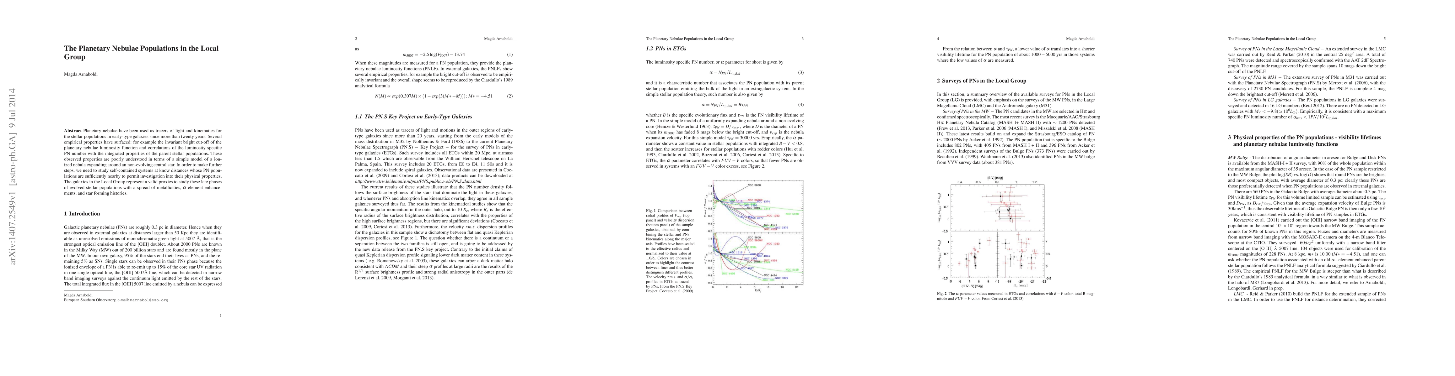 Planetary nebulae have been used as tracers of light and kinematics for the stellar populations in early-type galaxies since more than twenty years. Several empirical properties have surfaced: for example the invariant bright cut-off of the planetary nebulae luminosity function and correlations of the luminosity specific PN number with the integrated properties of the parent stellar populations. These observed properties are poorly understood in terms of a simple model of a ionized nebula expanding around a non-evolving central star. In order to make further steps, we need to study self-contained systems at know distances whose PN populations are sufficiently nearby to permit investigation into their physical properties. The galaxies in the Local Group represent a valid proxies to study these late phases of evolved stellar populations with a spread of metallicities, $\alpha$-element enhancements, and star forming histories.