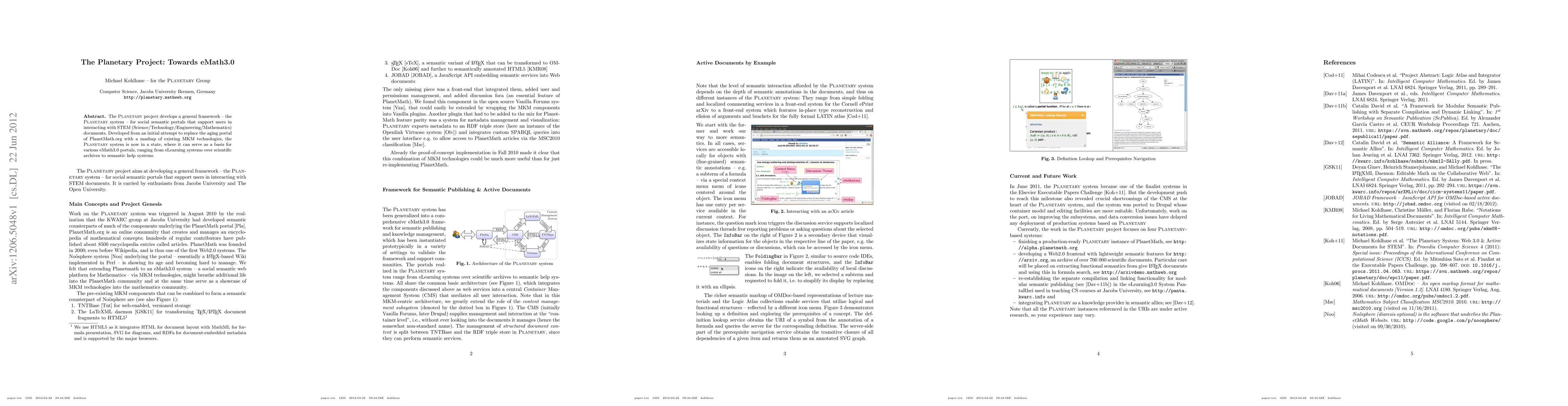 The Planetary project develops a general framework - the Planetary system - for social semantic portals that support users in interacting with STEM (Science/Technology/Engineering/Mathematics) documents. Developed from an initial attempt to replace the aging portal of PlanetMath.org with a mashup of existing MKM technologies, the Planetary system is now in a state, where it can serve as a basis for various eMath3.0 portals, ranging from eLearning systems over scientific archives to semantic help systems.