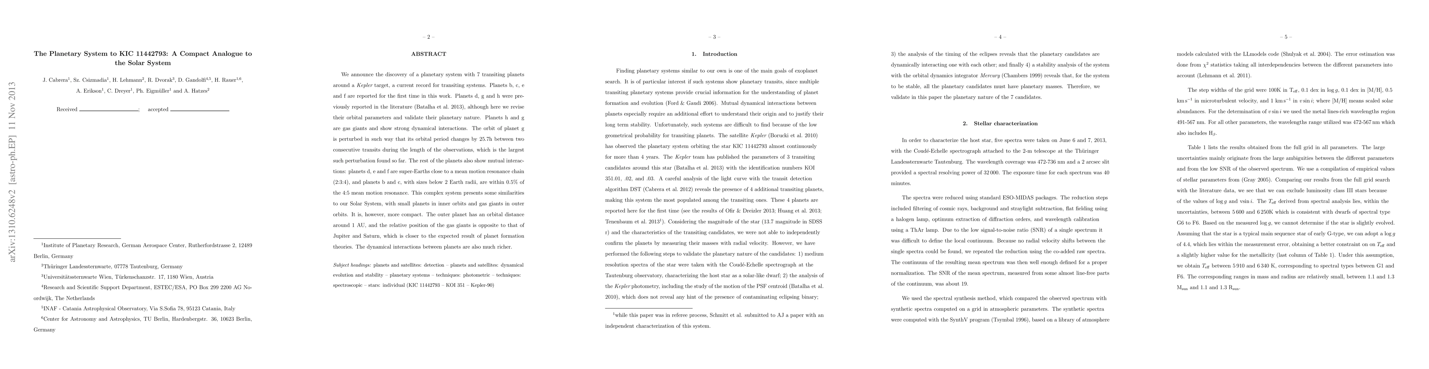We announce the discovery of a planetary system with 7 transiting planets around a Kepler target, a current record for transiting systems. Planets b, c, e and f are reported for the first time in this work. Planets d, g and h were previously reported in the literature (Batalha et al. 2013), although here we revise their orbital parameters and validate their planetary nature. Planets h and g are gas giants and show strong dynamical interactions. The orbit of planet g is perturbed in such way that its orbital period changes by 25.7h between two consecutive transits during the length of the observations, which is the largest such perturbation found so far. The rest of the planets also show mutual interactions: planets d, e and f are super-Earths close to a mean motion resonance chain (2:3:4), and planets b and c, with sizes below 2 Earth radii, are within 0.5% of the 4:5 mean motion resonance. This complex system presents some similarities to our Solar System, with small planets in inner orbits and gas giants in outer orbits. It is, however, more compact. The outer planet has an orbital distance around 1 AU, and the relative position of the gas giants is opposite to that of Jupiter and Saturn, which is closer to the expected result of planet formation theories. The dynamical interactions between planets are also much richer.