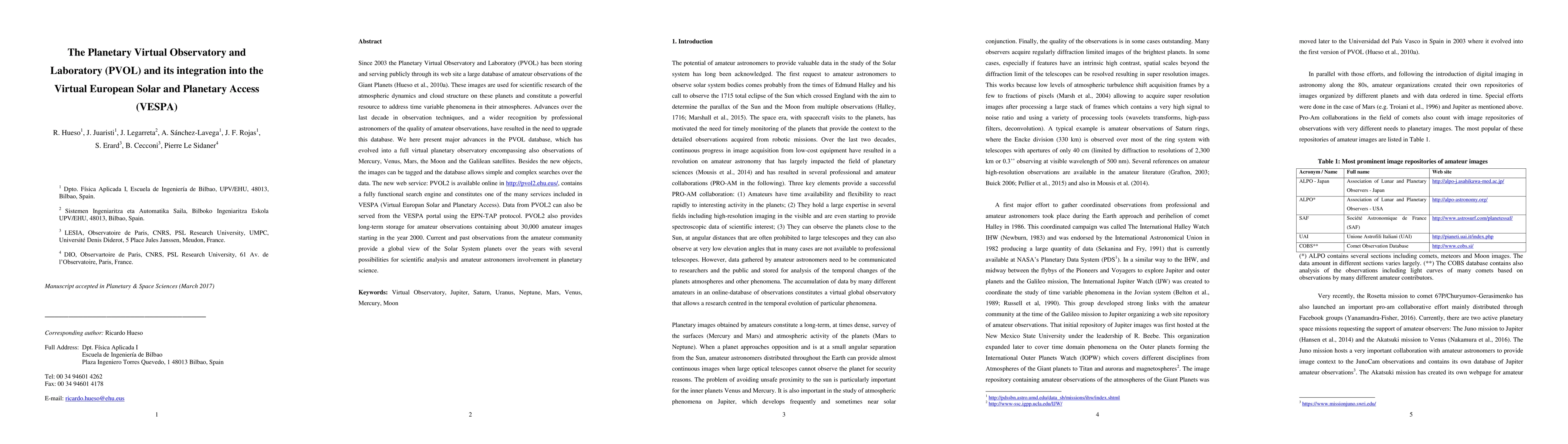 The Planetary Virtual Observatory and Laboratory (PVOL) has been upgraded to include observations of Mercury, Venus, Mars, the Moon, and Galilean satellites, and is now integrated into the Virtual European Solar and Planetary Access (VESPA) portal, offering advanced search capabilities and long-term storage for amateur observations. PVOL2, accessible online, serves as a valuable resource for planetary atmospheric dynamics research.