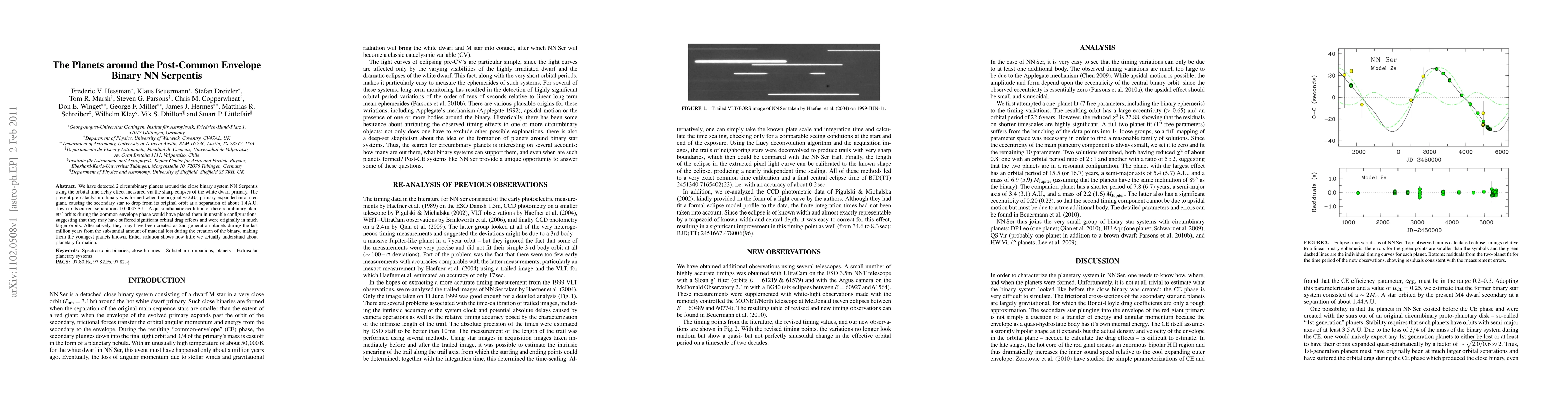 This study reveals the existence of two circumbinary planets around the post-common envelope binary NN Serpentis, detected through the orbital time delay effect during eclipses. The planets' origins remain uncertain, either from significant orbital drag or as second-generation planets formed recently from the binary's material loss.