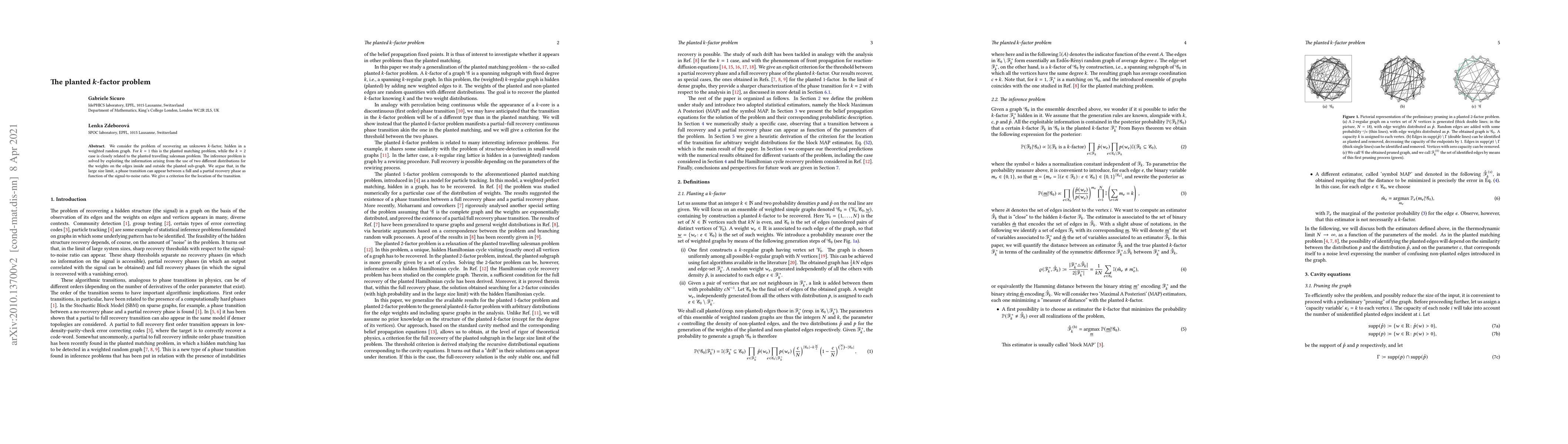 We consider the problem of recovering an unknown $k$-factor, hidden in a weighted random graph. For $k=1$ this is the planted matching problem, while the $k=2$ case is closely related to the planted travelling salesman problem. The inference problem is solved by exploiting the information arising from the use of two different distributions for the weights on the edges inside and outside the planted sub-graph. We argue that, in the large size limit, a phase transition can appear between a full and a partial recovery phase as function of the signal-to-noise ratio. We give a criterion for the location of the transition.
