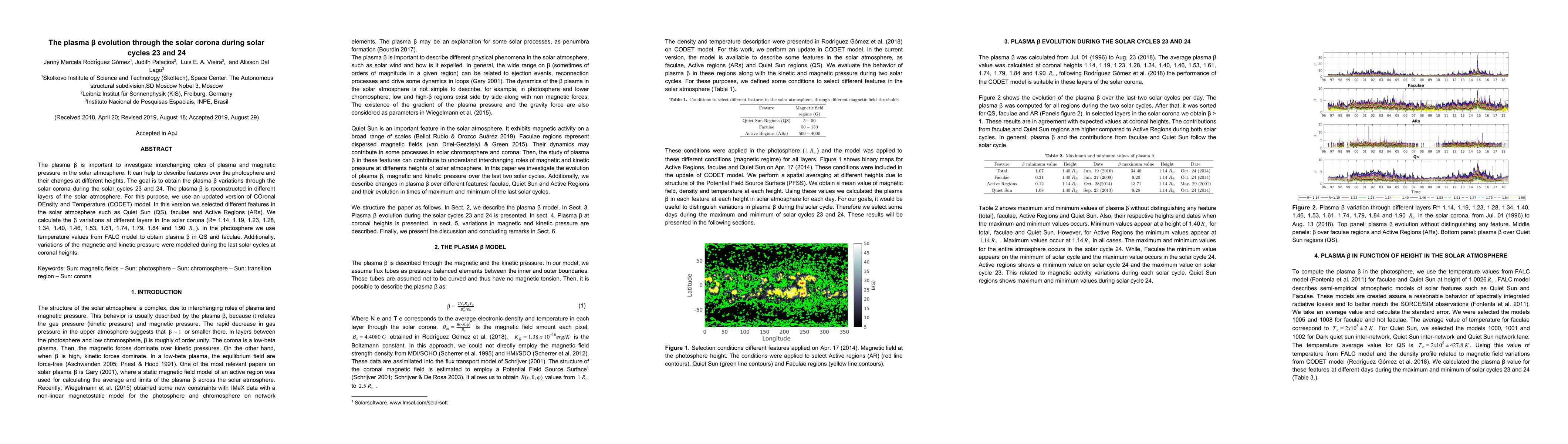 The plasma $\beta$ is important to investigate the interchanging roles of plasma and magnetic pressure in the solar atmosphere. It can help to describe features over the photosphere and their changes at different heights. The goal is to obtain the plasma $\beta$ variations through the solar corona during the solar cycles 23 and 24. The plasma $\beta$ is reconstructed in different layers of the solar atmosphere. For this purpose, we use an updated version of COronal DEnsity and Temperature (CODET) model. In this version, we selected different features in the solar atmosphere such as Quiet Sun (QS), faculae and Active Regions (ARs). We calculate the $\beta$ variations at different layers in the solar corona (R= 1.14, 1.19, 1.23, 1.28, 1.34, 1.40, 1.46, 1.53, 1.61, 1.74, 1.79, 1.84 and 1.90 $R_{\odot}$). In the photosphere, we use temperature values from FALC model to obtain plasma $\beta$ in QS and faculae. Additionally, variations of the magnetic and kinetic pressure were modelled during the last solar cycles at coronal heights. Accepted for publication in ApJ.