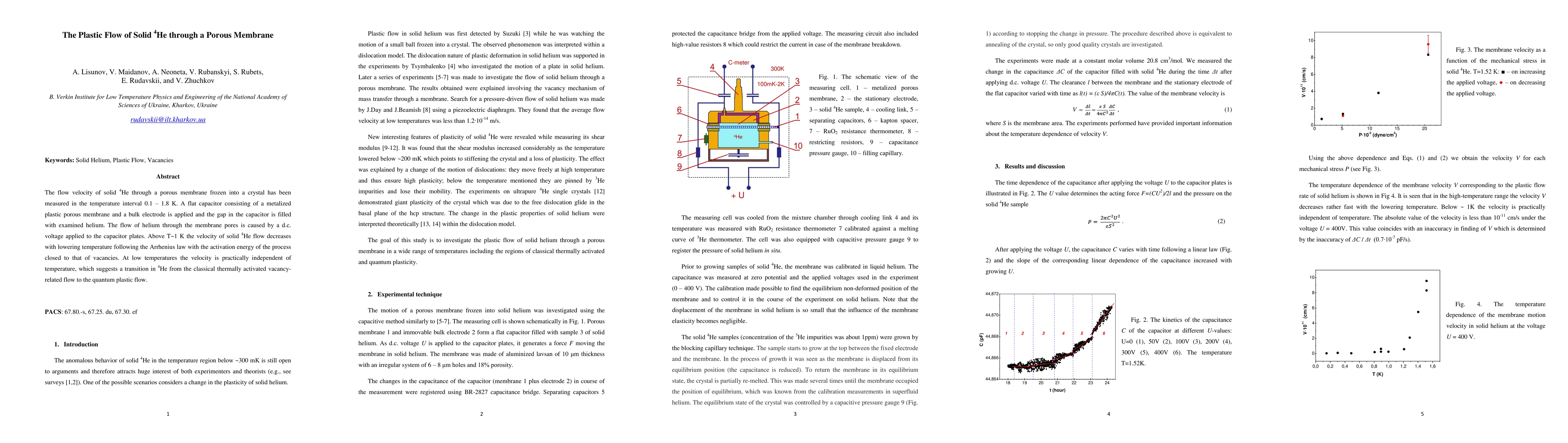 The flow velocity of solid 4He through a porous membrane frozen into a crystal has been measured in the temperature interval 0.1 - 1.8 K. A flat capacitor consisting of a metalized plastic porous membrane and a bulk electrode is applied and the gap in the capacitor was filled with examined helium. The flow of helium through the membrane pores is caused by a d.c. voltage applied to the capacitor plates. Above T~1K the velocity of solid 4He flow decreases with lowering temperature following the Arrhenius law with the activation energy of the process closed to that of vacancies. At low temperatures the velocity is practically independent of temperature, which suggests a transition in 4He from the classical thermally activated vacancy-related flow to the quantum plastic flow.
