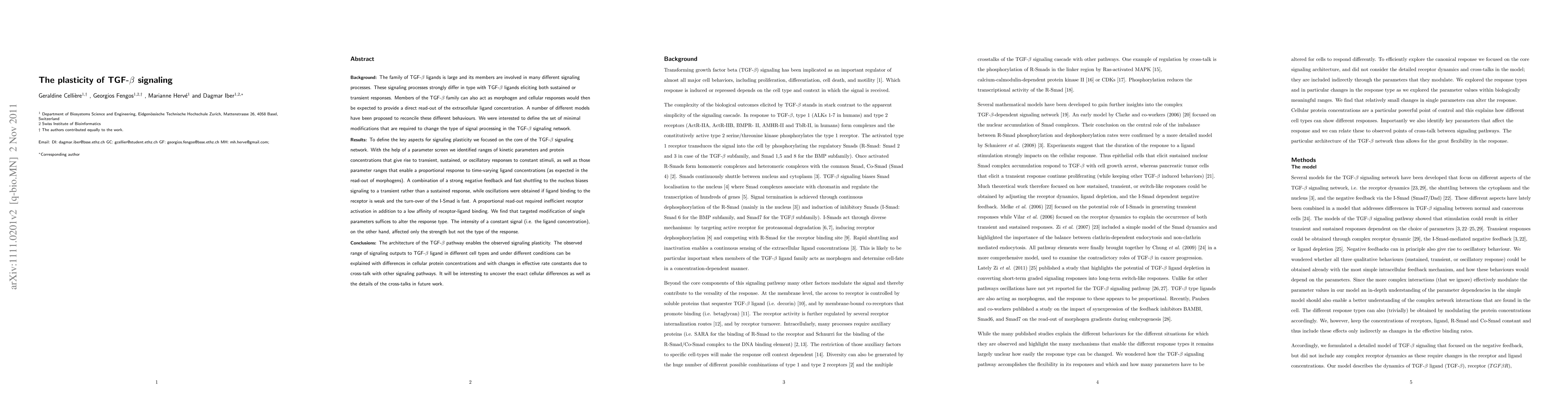 This paper investigates the plasticity of TGF-beta signaling, identifying minimal modifications that change signal processing types. It finds that specific parameter combinations, such as negative feedback and ligand-receptor dynamics, determine whether responses are transient, sustained, or oscillatory, and that signaling plasticity is enabled by the TGF-beta pathway's architecture.
