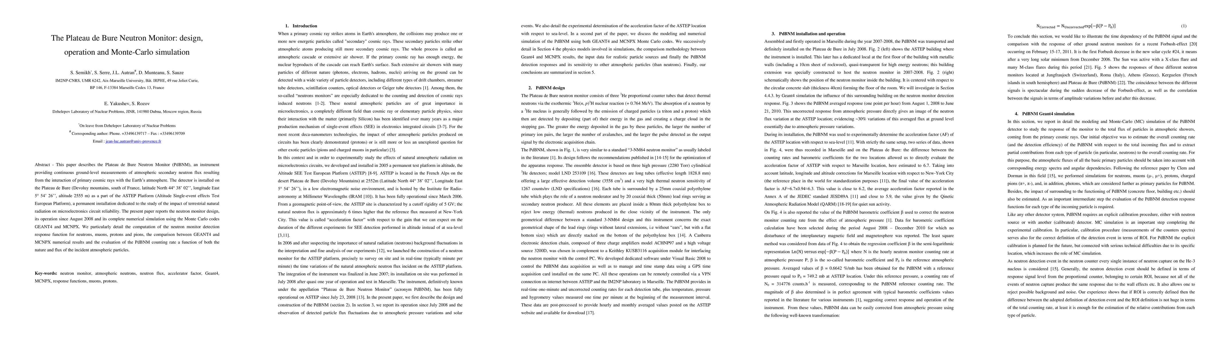 A neutron monitor instrument measures atmospheric secondary neutrons at a French mountain site, providing insights into cosmic ray interactions with the atmosphere. The study uses Monte Carlo simulations to model detection responses for different particles and evaluates its counting rate based on incident particle fluxes.
