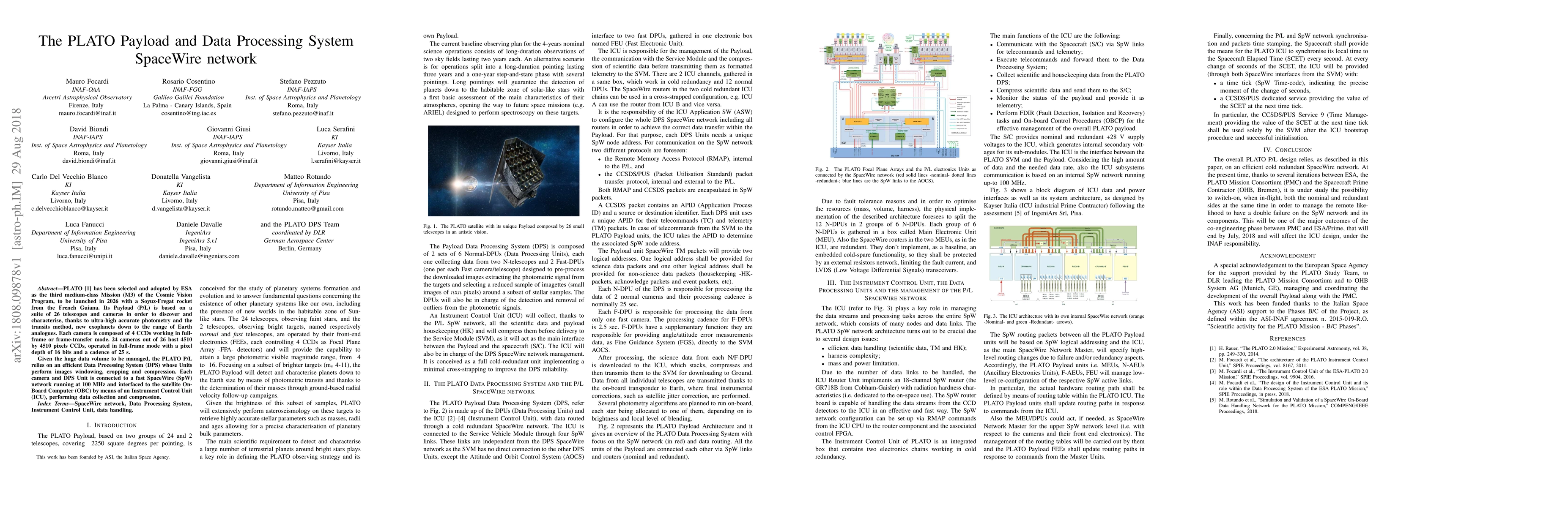 PLATO has been selected and adopted by ESA as the third medium-class Mission (M3) of the Cosmic Vision Program, to be launched in 2026 with a Soyuz-Fregat rocket from the French Guiana. Its Payload is based on a suite of 26 telescopes and cameras in order to discover and characterise, thanks to ultra-high accurate photometry and the transits method, new exoplanets down to the range of Earth analogues. Each camera is composed of 4 CCDs working in full frame or frame-transfer mode. 24 cameras out of 26 host 4510 by 4510 pixels CCDs, operated in full-frame mode with a pixel depth of 16 bits and a cadence of 25 s. Given the huge data volume to be managed, the PLATO Payload relies on an efficient Data Processing System (DPS) whose Units perform images windowing, cropping and compression. Each camera and DPS Unit is connected to a fast SpaceWire network running at 100 MHz and interfaced to the satellite On-Board Computer by means of an Instrument Control Unit (ICU), performing data collection and compression.