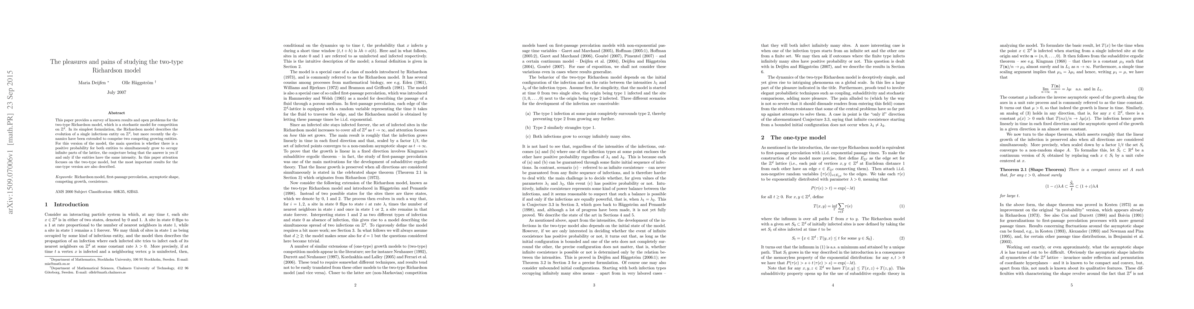 This paper provides a survey of known results and open problems for the two-type Richardson model, which is a stochastic model for competition on $\mathbb{Z}^d$. In its simplest formulation, the Richardson model describes the evolution of a single infectious entity on $\mathbb{Z}^d$, but more recently the dynamics have been extended to comprise two competing growing entities. For this version of the model, the main question is whether there is a positive probability for both entities to simultaneously grow to occupy infinite parts of the lattice, the conjecture being that the answer is yes if and only if the entities have the same intensity. In this paper attention focuses on the two-type model, but the most important results for the one-type version are also described.