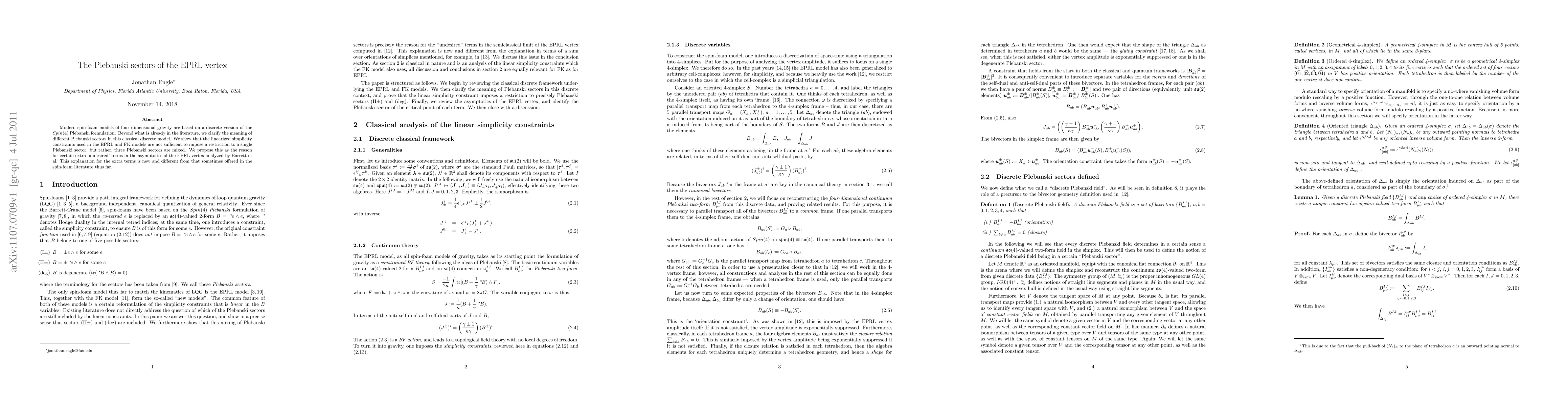 Modern spin-foam models of four dimensional gravity are based on a discrete version of the $Spin(4)$ Plebanski formulation. Beyond what is already in the literature, we clarify the meaning of different Plebanski sectors in this classical discrete model. We show that the linearized simplicity constraints used in the EPRL and FK models are not sufficient to impose a restriction to a single Plebanski sector, but rather, three Plebanski sectors are mixed. We propose this as the reason for certain extra `undesired' terms in the asymptotics of the EPRL vertex analyzed by Barrett et al. This explanation for the extra terms is new and different from that sometimes offered in the spin-foam literature thus far.