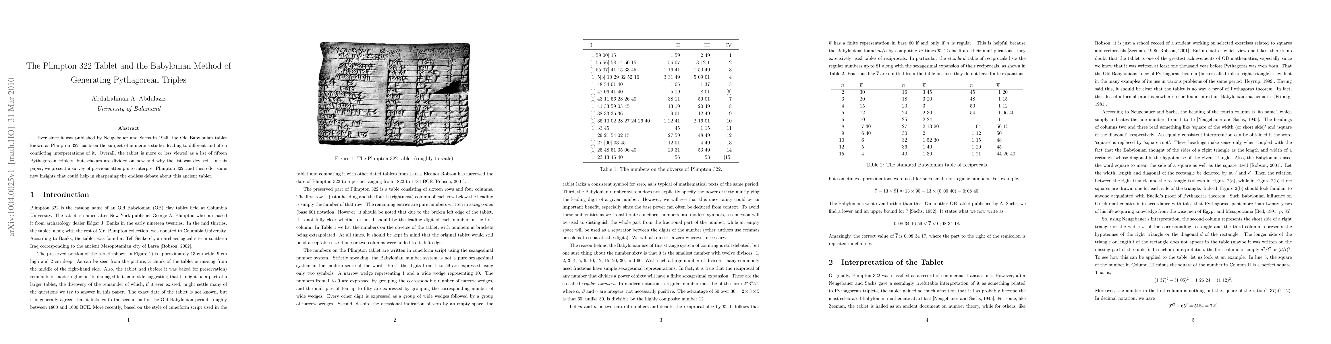 Ever since it was published by Neugebauer and Sachs in 1945, the Old Babylonian tablet known as Plimpton 322 has been the subject of numerous studies leading to different and often conflicting interpretations of it. Overall, the tablet is more or less viewed as a list of fifteen Pythagorean triplets, but scholars are divided on how and why the list was devised. In this paper, we present a survey of previous attempts to interpret Plimpton 322, and then offer some new insights that could help in sharpening the endless debate about this ancient tablet.