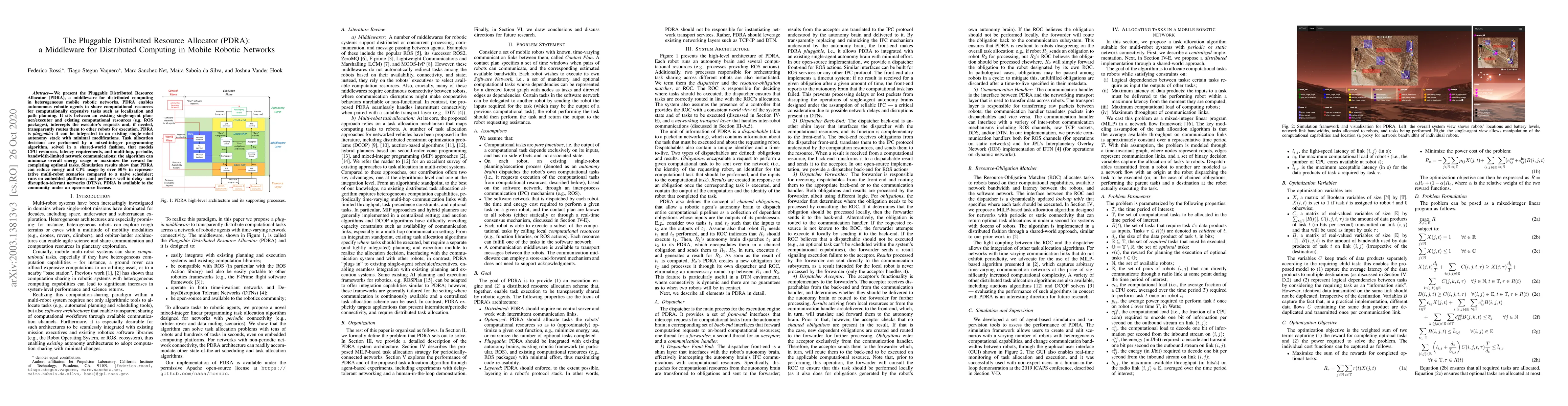 We present the Pluggable Distributed Resource Allocator (PDRA), a middleware for distributed computing in heterogeneous mobile robotic networks. PDRA enables autonomous robotic agents to share computational resources for computationally expensive tasks such as localization and path planning. It sits between an existing single-agent planner/executor and existing computational resources (e.g. ROS packages), intercepts the executor's requests and, if needed, transparently routes them to other robots for execution. PDRA is pluggable: it can be integrated in an existing single-robot autonomy stack with minimal modifications. Task allocation decisions are performed by a mixed-integer programming algorithm, solved in a shared-world fashion, that models CPU resources, latency requirements, and multi-hop, periodic, bandwidth-limited network communications; the algorithm can minimize overall energy usage or maximize the reward for completing optional tasks. Simulation results show that PDRA can reduce energy and CPU usage by over 50% in representative multi-robot scenarios compared to a naive scheduler; runs on embedded platforms; and performs well in delay- and disruption-tolerant networks (DTNs). PDRA is available to the community under an open-source license.